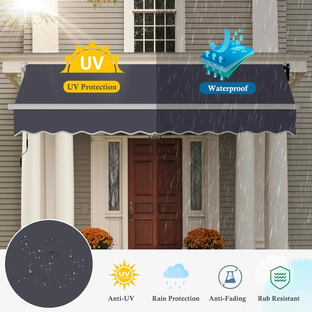 Crafted from high-quality polyester fabric with a PU coating, this awning is water-resistant and blocks harmful UV rays, helping to prevent sun damage and fading over time. The light grey color offers a neutral, modern look that complements a variety of outdoor decors. Supporting the canopy is a rust-resistant metal frame that combines durability with a lightweight design—strong enough to withstand moderate wind while remaining easy to operate.