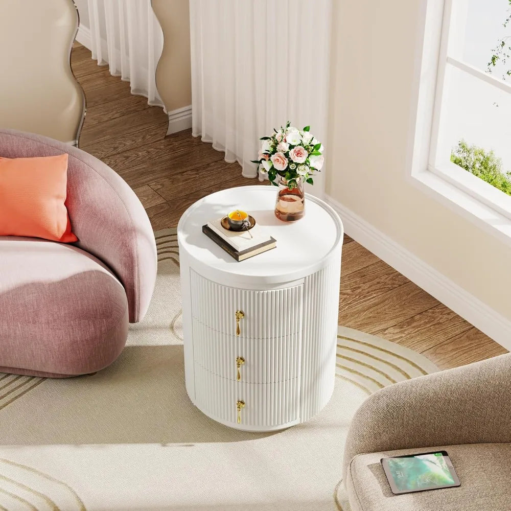 Crafted with a sleek white finish complemented by gold handles, these small round side tables add a modern, refined touch to any decor. The smooth top surface is perfect for placing your nightly essentials such as lamps, books, phones, or a comforting cup of coffee. Beneath the surface, three spacious drawers provide ample storage for smaller items, helping you keep your space neat and clutter-free. Thanks to the full extension drawer slides, accessing your belongings is effortless, even in the deepest corners of each drawer.