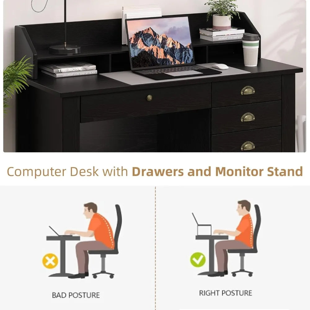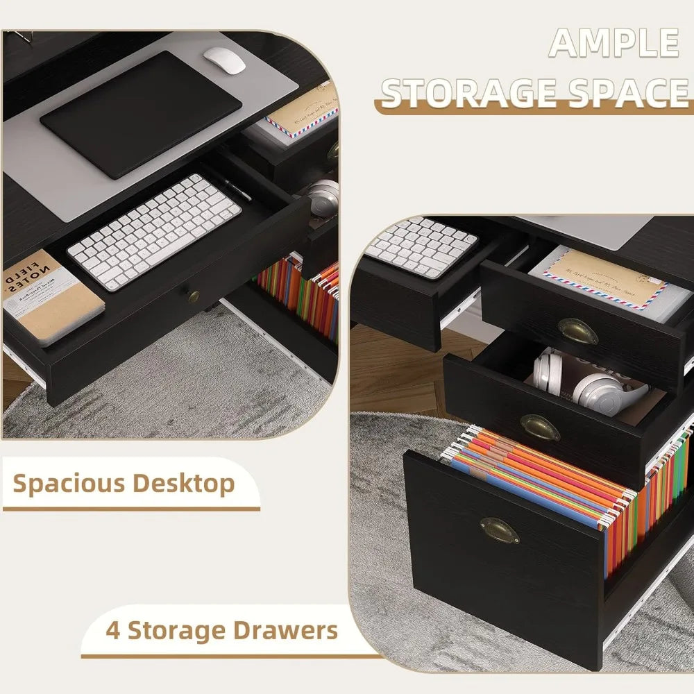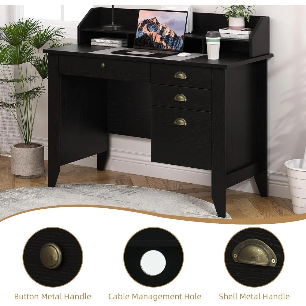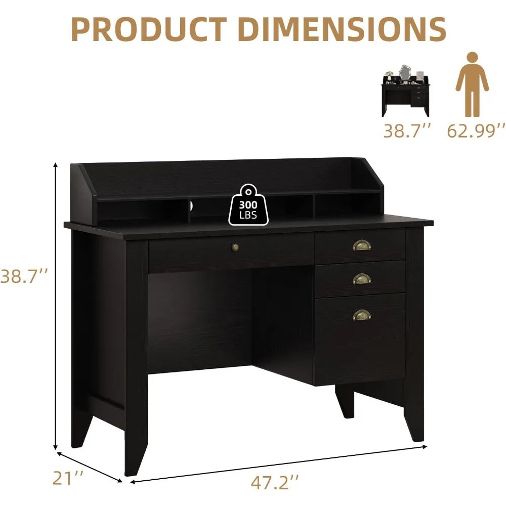 Meet the Black Desk with Drawers: all the style and practical features you need, at a price that respects your budget. This compact yet spacious desk is designed to bring smart organization and comfort to your home office, bedroom, or creative space. Crafted with a sturdy wood base and finished in a sleek black wood grain, this desk combines modern design with a touch of Victorian retro charm. The vintage bronze shell handles on the four drawers add character while ensuring easy access to your essentials. The beveled legs give the desk a contemporary twist, making it a stylish addition that fits seamlessly into various room styles. The 47.2" wide desktop offers ample space for your daily tasks, whether it’s writing, computer work, or creative projects. On top, a built-in monitor stand elevates your screen to a comfortable viewing height, helping to reduce neck strain during long hours at your desk. Meanwhile, cable management holes at the back keep cords organized and your workspace clutter-free, so you can focus on what matters most. Storage is thoughtfully designed to meet different needs: four drawers of varying sizes hold everything from stationery to personal items, while a larger file drawer fits A4-sized folders neatly. The shelf on the desktop doubles as additional storage or a convenient place for your monitor, keeping your essential tools within easy reach. Durability is a key feature of this desk. Made from thick wood, it supports up to 140 pounds on the desktop without wobbling. The solid wooden legs provide reliable stability, ensuring the desk stands firm whether you’re typing, writing, or using multiple devices. Assembly is straightforward with clear instructions included, making setup a hassle-free experience. Should you have any questions or need assistance, the FurnitureZ support team is ready to help. Why You'll Love It: