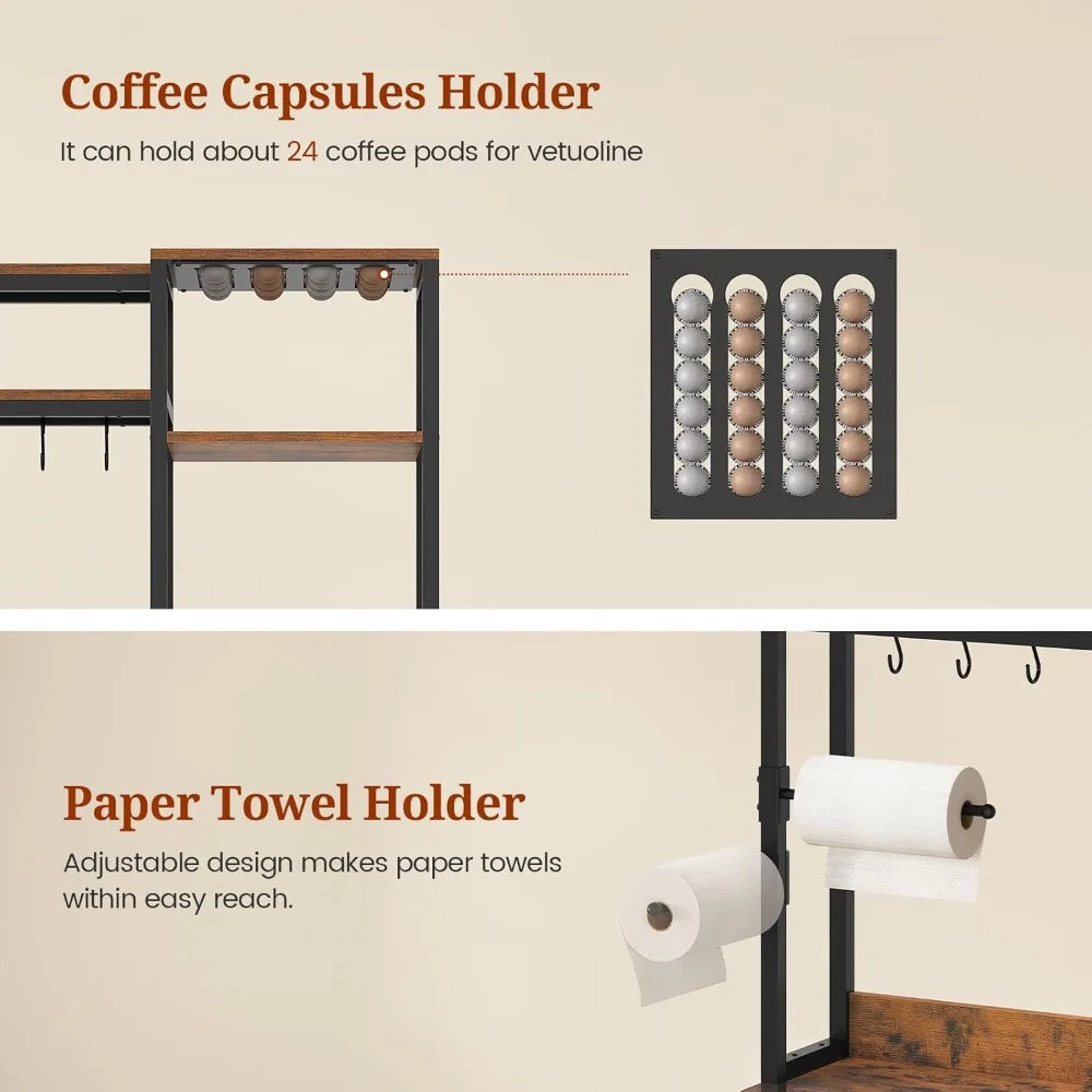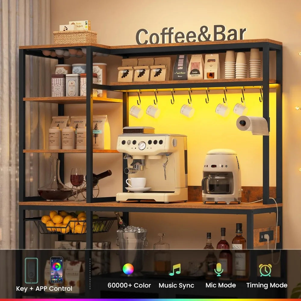 Meet the 47.2" Bakers Rack with Power Outlet & LED Light by FurnitureZ: a smart, stylish solution that brings both function and value to your kitchen or coffee nook. Designed to make your daily routines easier and more organized, this versatile baker’s rack combines quality materials, thoughtful features, and practical storage—all at a price that respects your budget. Crafted with engineered wood paired with a sturdy metal frame, this rack offers durability that stands up to everyday use. The rustic brown finish adds a warm, inviting touch to your space while resisting wear and tear. Adjustable feet and an anti-tip device ensure stability even on uneven floors, so you can trust this piece to stay secure and steady in your home. This baker’s rack goes beyond just storage: it includes 2 AC power outlets and 2 USB sockets, allowing you to power multiple appliances like your microwave and coffee machine simultaneously without the hassle of extra cords or searching for available plugs. The RGB LED light offers over 60,000 colors and 29 flashing modes, controllable via an app or buttons, adding customizable ambiance to your space whether you're brewing your morning coffee or hosting friends. Coffee lovers will appreciate the built-in coffee pod holder made from solid metal, designed to hold about 24 Vetuo pods securely and within easy reach. The towel rack attaches conveniently to any metal tube on the rack, keeping your kitchen towels accessible and organized. Storage is a breeze thanks to the 10 open shelves, 8 S-hooks, a pull-out wire basket, a wine rack, and a cabinet—all thoughtfully arranged to help you sort and store your kitchen essentials neatly. This integrated design maximizes space without crowding your room, making it ideal for small kitchens, apartments, or even home offices where extra storage is a must. Assembly is straightforward and user-friendly: all parts come clearly labeled with simple instructions, and included stickers help cover any wood holes from DIY assembly for a clean finish. Plus, FurnitureZ provides responsive customer support ready to assist within 24 hours, so you can assemble your new baker’s rack with confidence. Why You'll Love It: