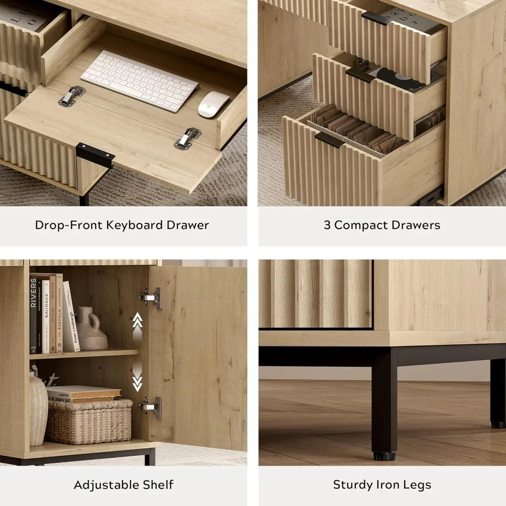 The desk also features a drop-front keyboard tray that helps free up surface space while promoting ergonomic comfort. The fluted panel design isn’t just for looks—it cradles your devices and cables, helping you keep your workspace organized and free from distractions. This textured detail adds a touch of sophistication without overwhelming your room’s decor.