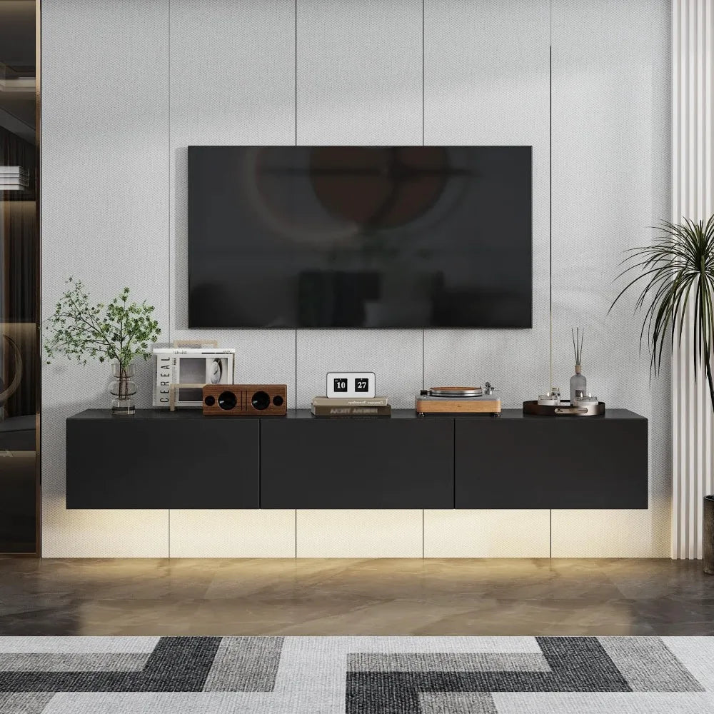 Built with engineered wood featuring a high-gloss black finish, this floating TV stand combines style with easy maintenance. The smooth surface wipes clean effortlessly, making it ideal for everyday living. Thanks to its sturdy MDF and particle board construction, you get a durable piece that holds up well over time, supporting your TV and media essentials securely.