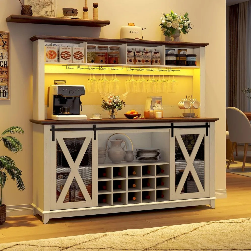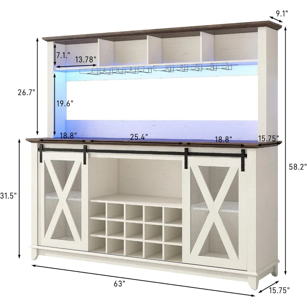 Meet the 63" Wide 58H Farmhouse Coffee Bar Cabinet with LED Light: all the style and durability you want, at a price you'll appreciate. This cabinet brings together rustic charm and practical design, making it a smart choice for anyone looking to enhance their kitchen, dining room, or living area with a versatile, quality piece that stands the test of time.