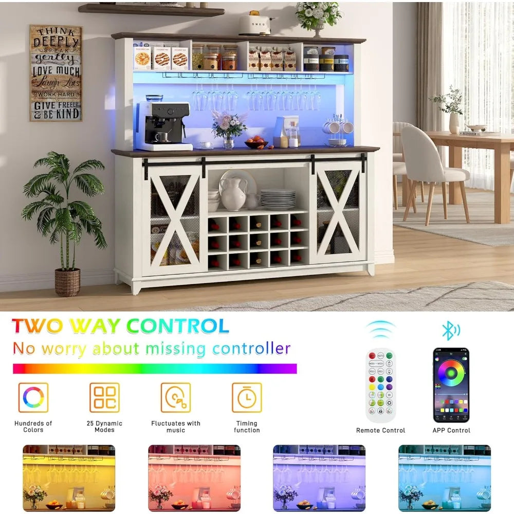 One of the standout features of this coffee bar cabinet is the integrated RGB LED light strip. Controlled via a mobile app or remote, the light strip offers up to 60,000 color options, with adjustable brightness and modes, plus music synchronization and timing functions. This makes it perfect for wine tastings, parties, or simply showcasing your collection with a customizable ambiance that suits any occasion.