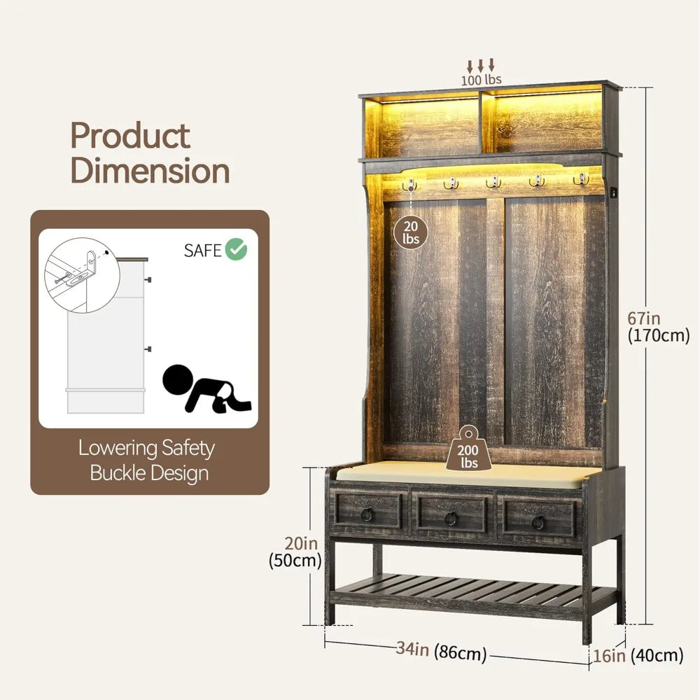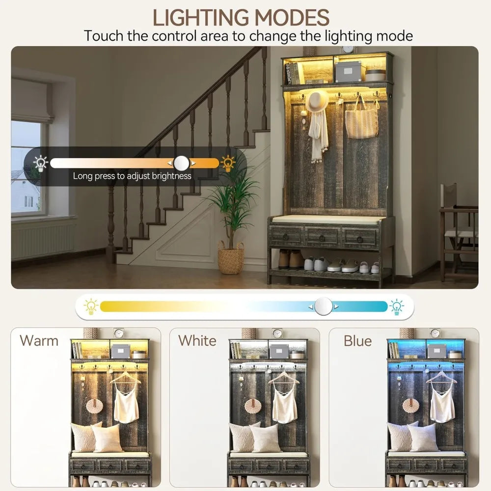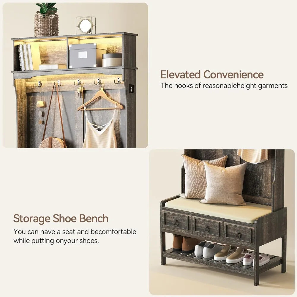 Meet the 67 Inch Farmhouse Style Hall Tree with Shoe Storage and Automatic Sensor LED Lighted Coat Rack: a smart, stylish, and practical addition to your entryway that balances quality and value perfectly. Designed by FurnitureZ, this 3-in-1 entryway bench combines multiple functions to help you organize your space without compromising on style or durability.
