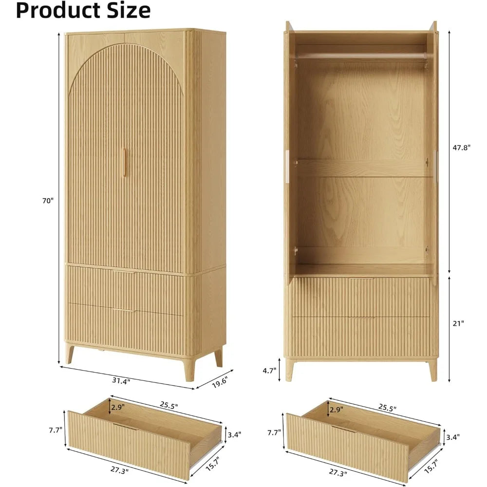 Meet the 70.1 Inch Arched Wooden Wardrobe with Double Doors and Drawers from FurnitureZ: all the style and durability you want, at a price you'll appreciate. This wardrobe is thoughtfully designed to bring both elegance and practical storage solutions to your bedroom without overextending your budget.