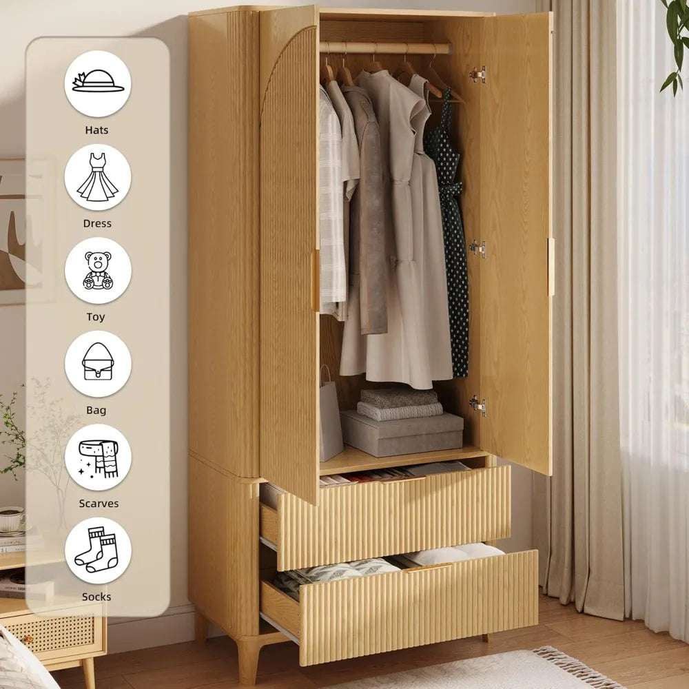 Crafted from engineered wood with a sturdy density board construction, this wardrobe offers lasting stability and strength. The solid wooden base supports your belongings securely, making it ideal for everyday use. The natural wood grain paired with a matte paint finish delivers a subtle rustic charm that complements modern, Nordic, or minimalist interiors effortlessly. Its French arch design doors, detailed with vertical groove lines and hidden gold handles, add a refined touch that elevates your room’s aesthetic without overwhelming it.