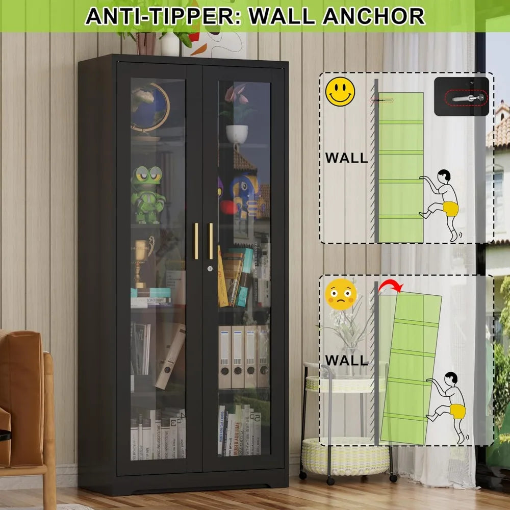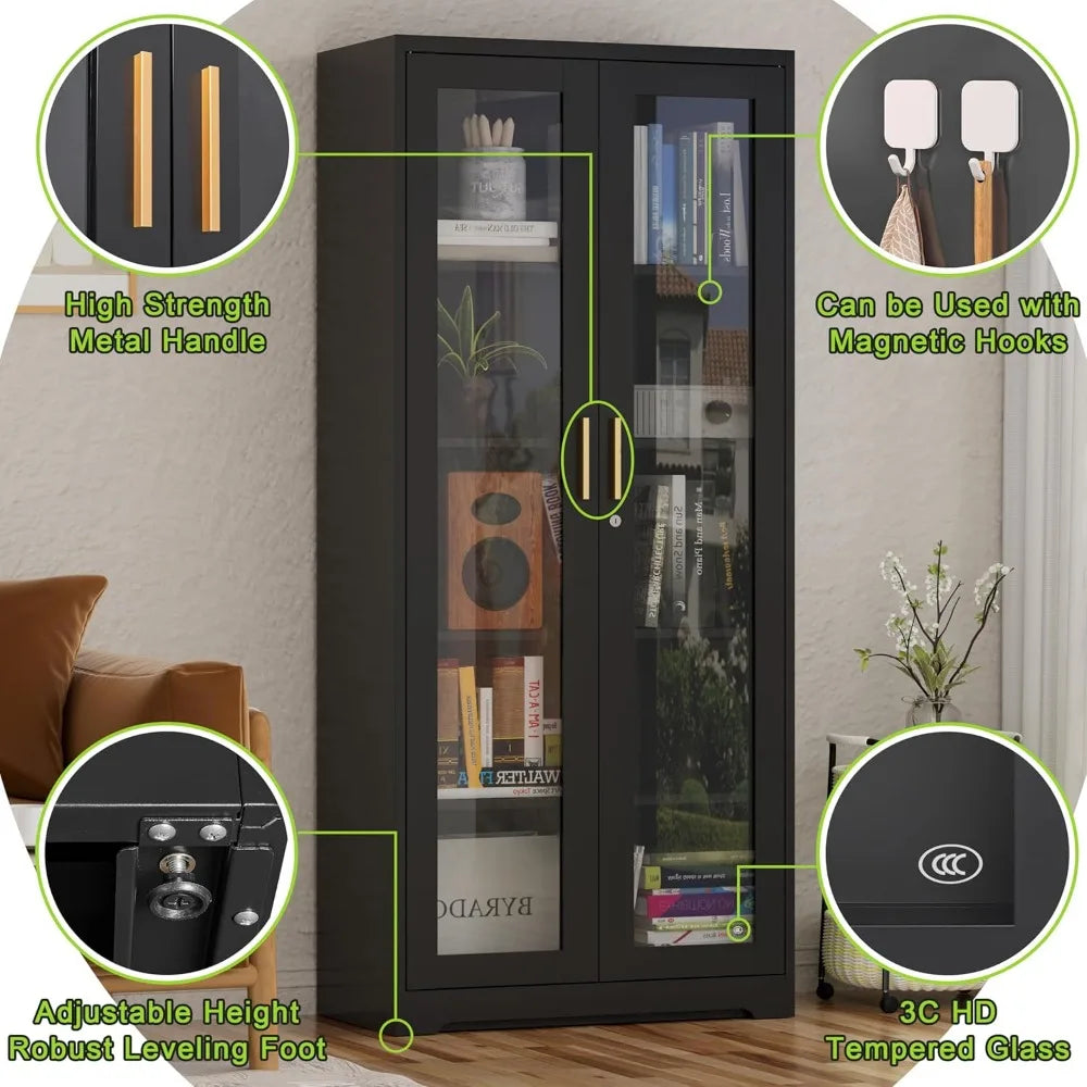 The cabinet’s two doors are made from tempered glass, a safer choice that minimizes risk from breakage by preventing sharp fragments. Behind these doors, you'll find four adjustable shelves, allowing you to customize the interior to fit items of different sizes—from delicate china and collectibles to books and office supplies. The two locking doors provide peace of mind when storing valuable or fragile items, while two holes on the back panel offer the option to secure the cabinet to a wall, preventing tipping and enhancing safety—particularly in homes with children or pets.