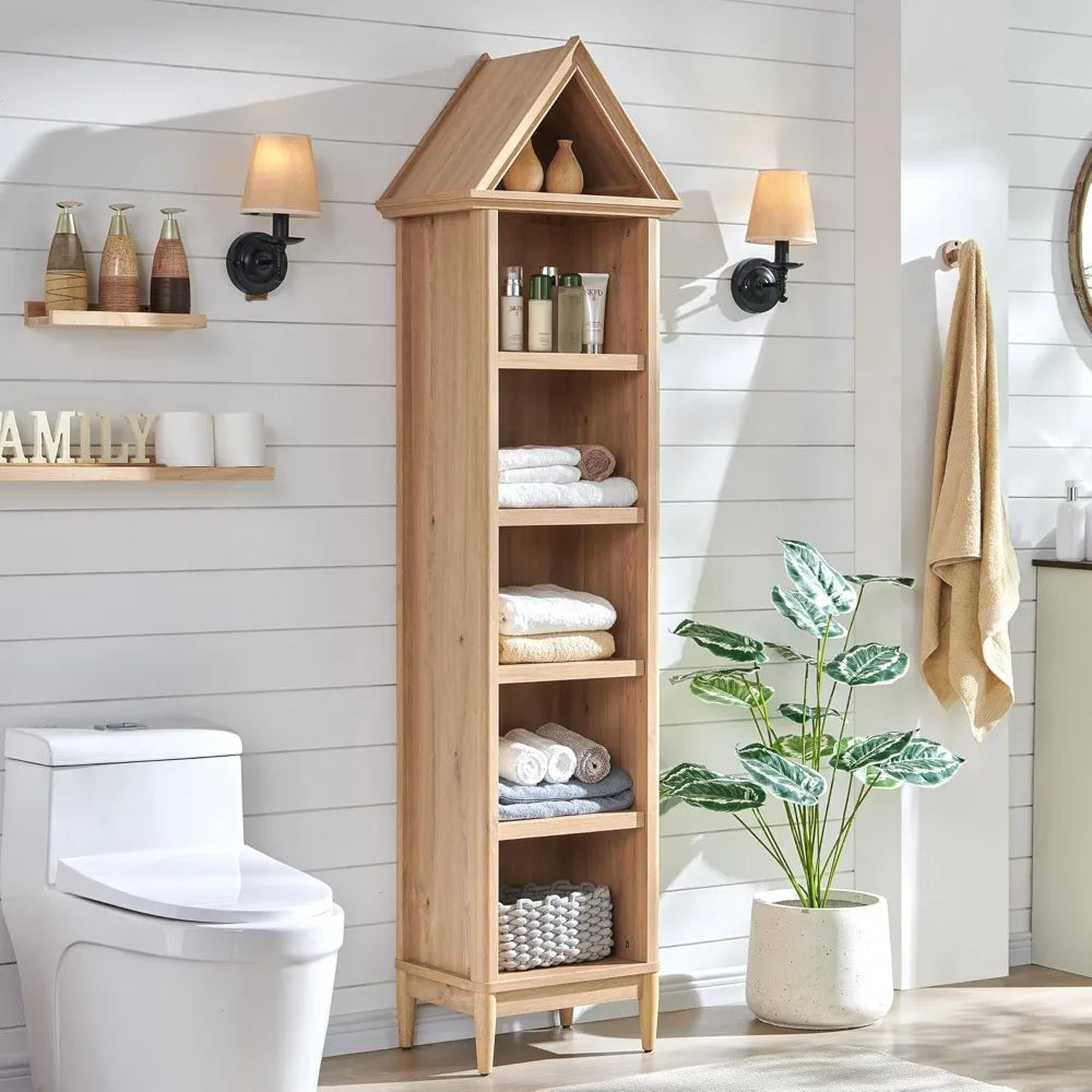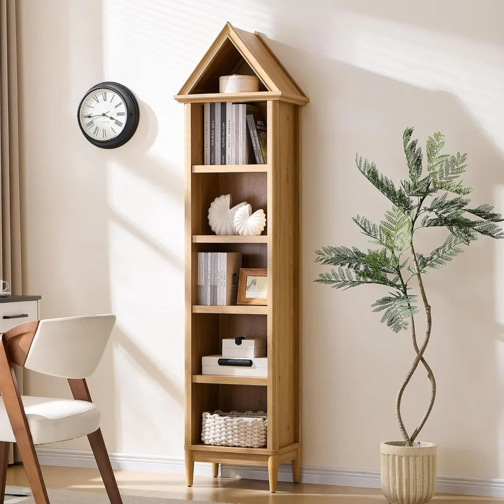 This narrow bookshelf stands out with its unique geometric design, featuring a striking angled arch crown that transforms the traditional farmhouse style into a contemporary piece of functional art. With a depth of just 13.8 inches and a height of 75.9 inches, it’s crafted to maximize your floor space while providing ample vertical storage. Whether you’re furnishing a compact apartment or adding character to a home office, this bookcase creates a visual anchor that’s both elegant and efficient.