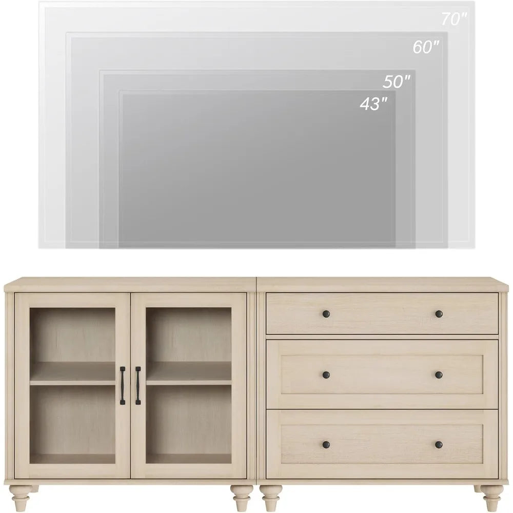 Meet the 75" TV Wood Entertainment Center by FurnitureZ: all the style and durability you want, at a price you'll appreciate. This smartly designed living room cabinet blends functionality and elegance, making it a versatile addition to your home that fits both your aesthetic and practical needs. Crafted with a distressed light oak finish and a mid-century modern style, this entertainment center offers a sophisticated look that complements a wide range of interior designs. Its rectangular shape and dimensions of 67.7 x 15.7 x 30.9 inches provide ample space for your TV and media essentials without overwhelming your room. What sets this piece apart is its thoughtful 2-in-1 design—use it as a standalone glass cabinet or a dresser, depending on your space and storage needs. Whether serving as an entertainment center, a kitchen buffet, or a console table in your entryway, it adapts seamlessly to your lifestyle. Inside, you'll find an adjustable shelf that lets you customize storage to fit items of various sizes, maximizing your space efficiently. The transparent tempered glass door not only adds a touch of elegance but also makes it easy to locate your belongings at a glance. The drawers feature smooth metal slides for effortless access, ensuring daily use is convenient and enjoyable. Built on a stable frame with high-quality materials, this cabinet supports up to 100 lbs on the glass section and 88 lbs on the dresser, so you can confidently store your essentials. The smooth, waterproof surface is easy to clean—just wipe it down with a soft damp cloth to keep it looking fresh. Assembly is straightforward with the detailed instructions included, and while the unit ships in separate packages (which may arrive on different days), setting it up is a manageable task that typically doesn’t require professional help. Should you have any questions, our dedicated team is ready to assist you with expert support. Why You'll Love It: