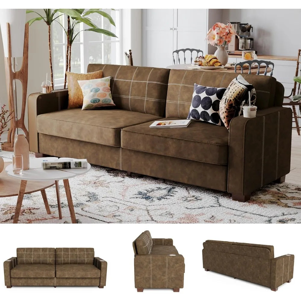 What sets this sofa apart is the attention to detail. The prominent jumbo contrast stitching and clean-lined divided back create a fashionable look that naturally draws the eye. Plus, the built-in cup holders on each armrest bring everyday convenience right where you need it — perfect for keeping your drink close during movie nights or casual gatherings, without compromising the sofa’s sleek design.