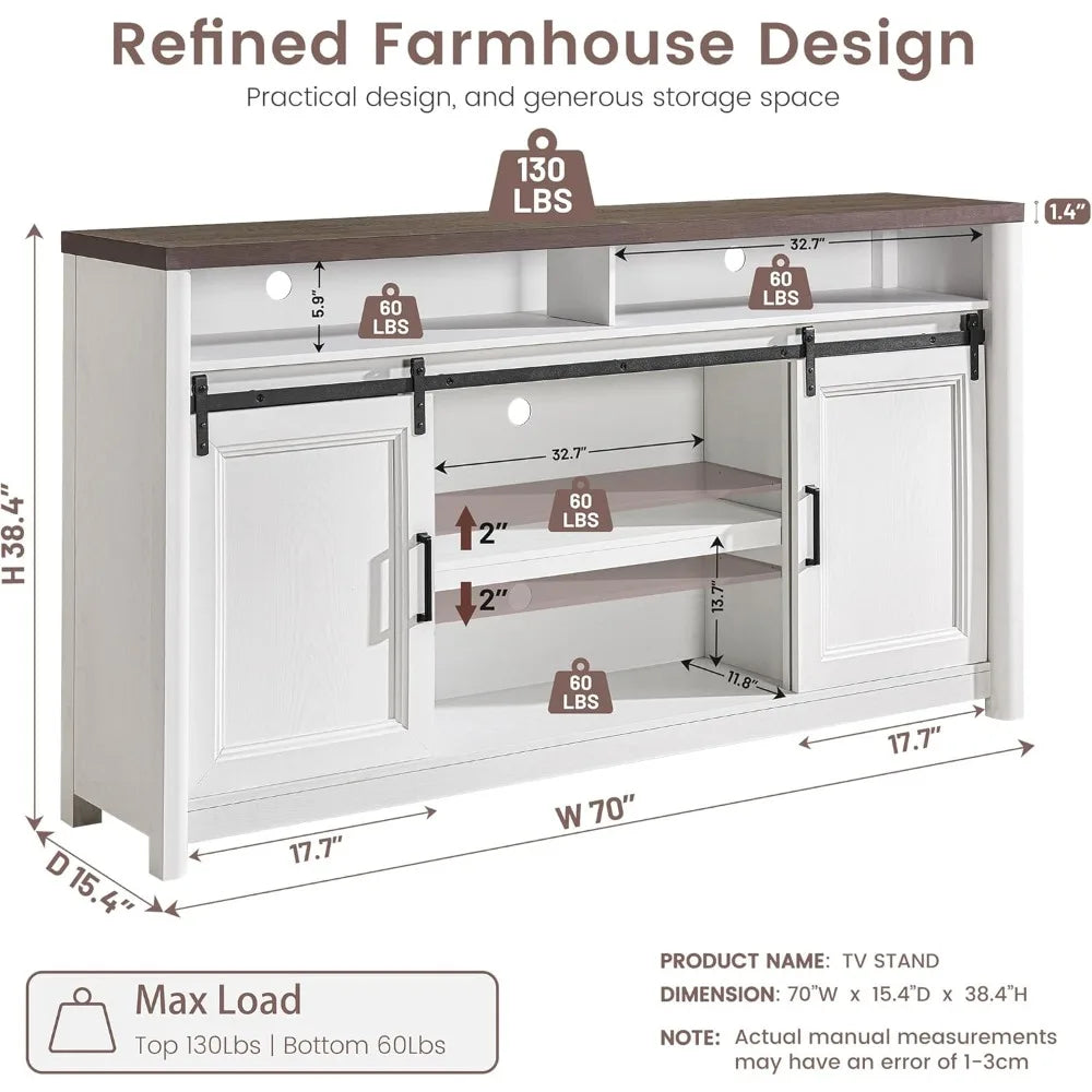 Designed to accommodate TVs up to 80 inches, this unit measures 70 inches wide, 15.4 inches deep, and 38.4 inches high, making it a versatile centerpiece for rooms of various sizes. The sliding barn door design isn’t just for looks—it provides easy access to the storage compartments while saving space compared to swinging doors. Inside, you’ll find three adjustable shelves and a dedicated soundbar shelf, offering flexible storage options for your entertainment devices, gaming consoles, and media collections. Cord holes in the back help you keep cables organized and out of sight, so your setup stays clean and clutter-free.