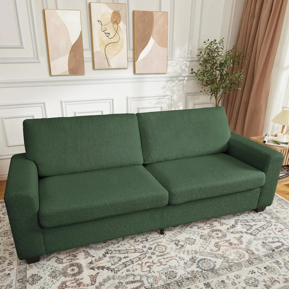 Built on a sturdy solid wood frame, this sofa promises reliable durability for everyday living. Its generous size (83.86D x 29.92W x 32.68H inches) comfortably seats three adults, giving everyone enough space to relax without feeling crowded. The deep seating invites you to sink in, and the wide armrests add an extra layer of comfort — perfect for lounging, reading, or catching up with friends. At a seat height of 16.93 inches, it balances comfort and ease, making it simple to sit down and stand up.
