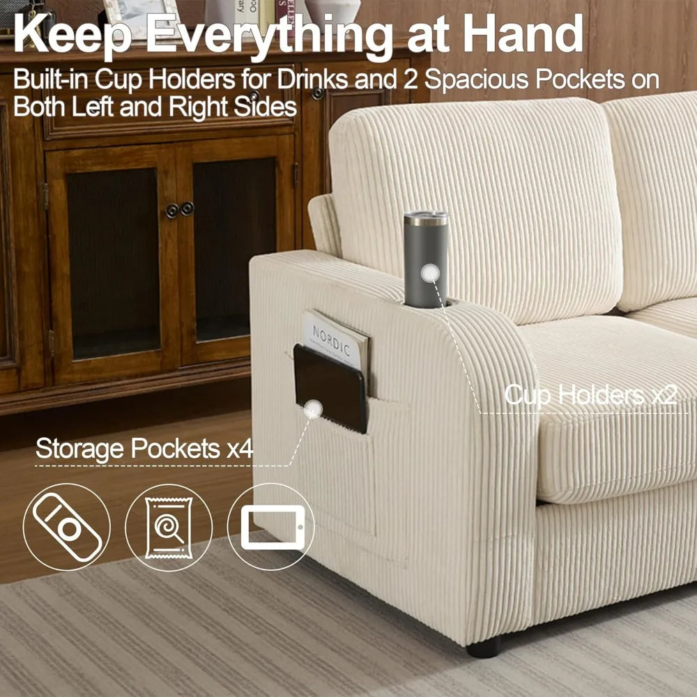 Designed with convenience in mind, this 3-seater couch includes two built-in cup holders to keep your drinks close by and four side pockets for storing remotes, magazines, tablets, and more. This thoughtful design helps you stay organized without cluttering your space. The oversized back cushions (measuring 26.4" L × 16.7" W) provide firm support, allowing you to relax comfortably whether you’re watching TV or catching up with friends.