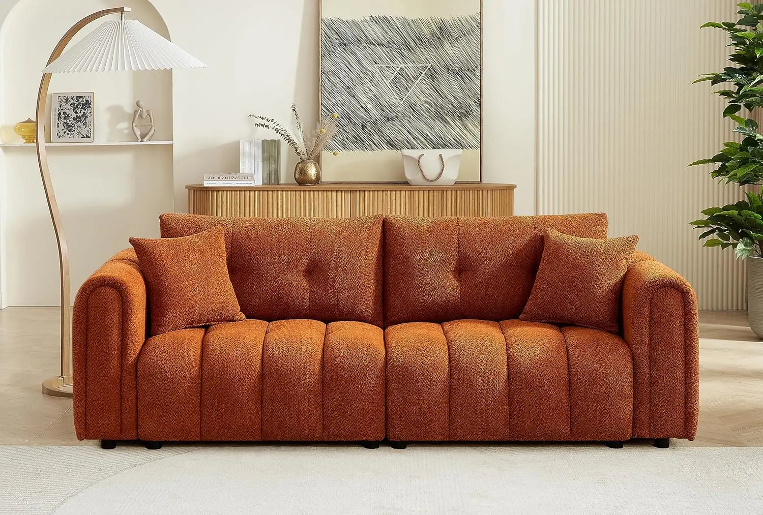 The sleek, rectangular silhouette of this sofa is enhanced by its distinctive piano-key design and gently curved armrests—details that give it a refined, modern look without feeling overly formal. Wrapped in premium wrinkle-resistant boucle fabric, the sofa not only stands out visually but also offers a soft, breathable surface that’s comfortable to lounge on and easy to maintain. Whether placed in your living room, bedroom, or home office, this couch acts as a stylish anchor that complements a variety of décor styles, from modern Scandinavian to contemporary Morocco-inspired interiors.