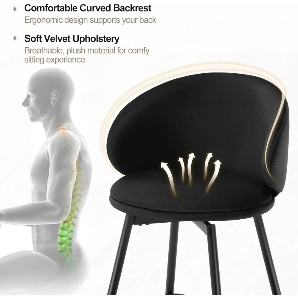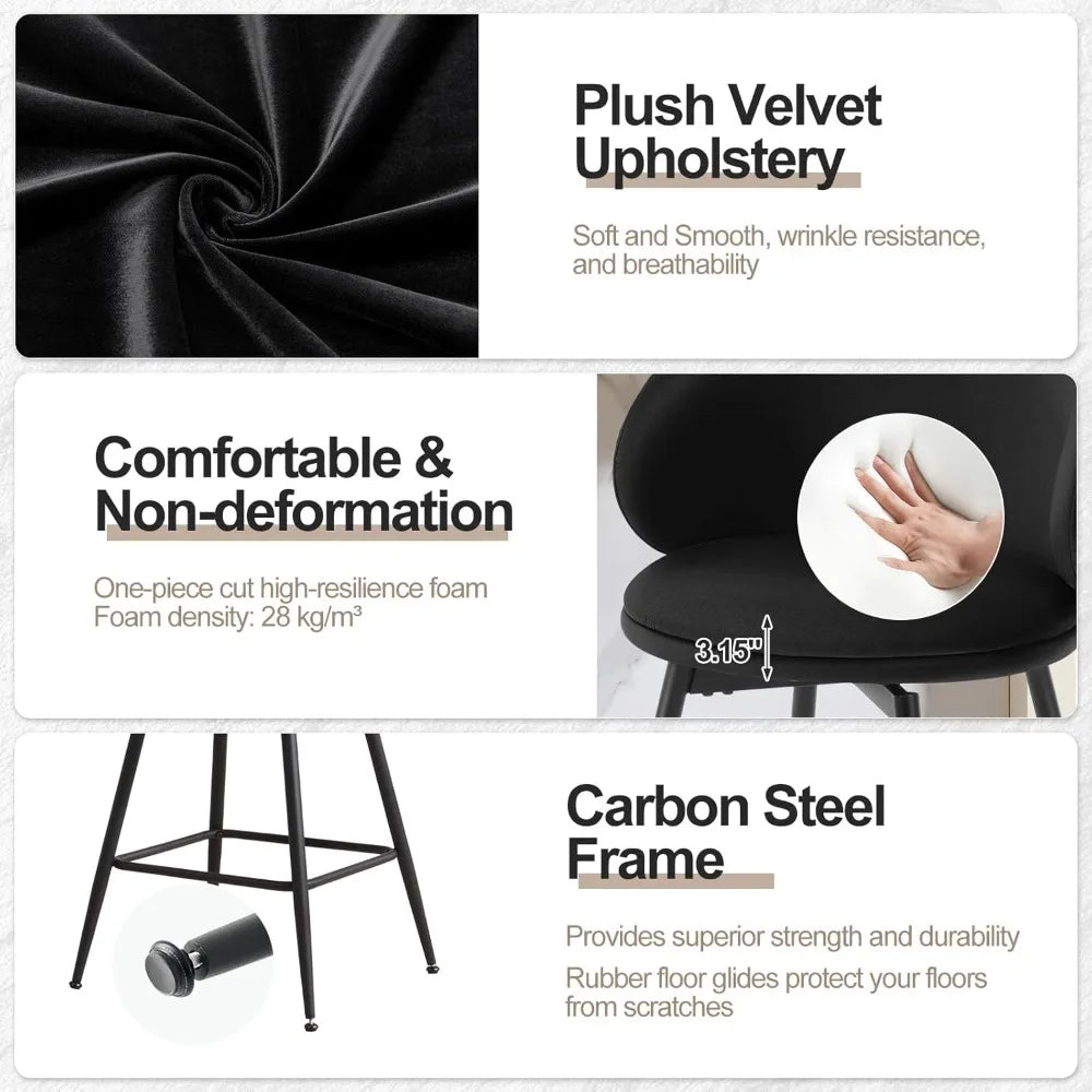 Meet the 26" Counter Height Swivel Bar Stools with Back, a smart and stylish choice that brings together comfort, durability, and modern design at a price that makes sense. Whether you're outfitting your kitchen island, breakfast bar, or home bar area, this set of three bar stools offers real quality without stretching your budget. Crafted with care, these stools feature a premium 300g/㎡ velvet fabric that feels soft to the touch and looks elegant in any setting. This velvet is thicker and more luxurious than common options, providing a plush seating experience that lasts. Inside, a high-elasticity sponge cushion supports you comfortably, maintaining its shape through everyday use so you can enjoy sitting for extended periods without discomfort. The barrel-shaped seat design adds to the cozy feel while giving a contemporary aesthetic that complements your home décor. Built to last, the Bekrvio stools rest on a sturdy metal frame with thickened carbon steel legs. This robust construction not only ensures excellent stability but also supports up to 300 lbs confidently. To protect your floors and keep the stools steady, each leg is fitted with adjustable rubber floor glides that prevent scratches and adapt to uneven surfaces. The 360-degree swivel seat adds versatility, allowing you to turn effortlessly whether you're chatting with guests or reaching for something on your counter. Comfort is at the forefront of this design. The ergonomic curved backrest provides gentle lumbar support, encouraging good posture during meals or casual conversations. The seat’s generous 3.15-inch thick padding combines softness with firm support, striking the right balance for comfort and durability. Together with the solid legs, this creates a stable and long-lasting foundation that feels secure every time you sit down. These stools measure 26 inches in seat height, making them an ideal match for counters between 36 and 40 inches tall. Their sleek black velvet upholstery paired with a modern silhouette and metal frame brings a fashionable yet functional element to various spaces — from kitchens and living rooms to bars, coffee shops, or breakfast nooks. They don’t just fill a spot; they enhance your space with their understated elegance. Assembly is straightforward and quick, designed to fit into your busy lifestyle. The set of three comes with clear instructions, high-quality hardware, and all the tools you need to have your bar stools ready in about 10-15 minutes. Whether you’re a seasoned DIYer or a first-time assembler, you’ll appreciate how hassle-free it is to get these stools set up and ready for use. Why You’ll Love the 26" Counter Height Swivel Bar Stools: