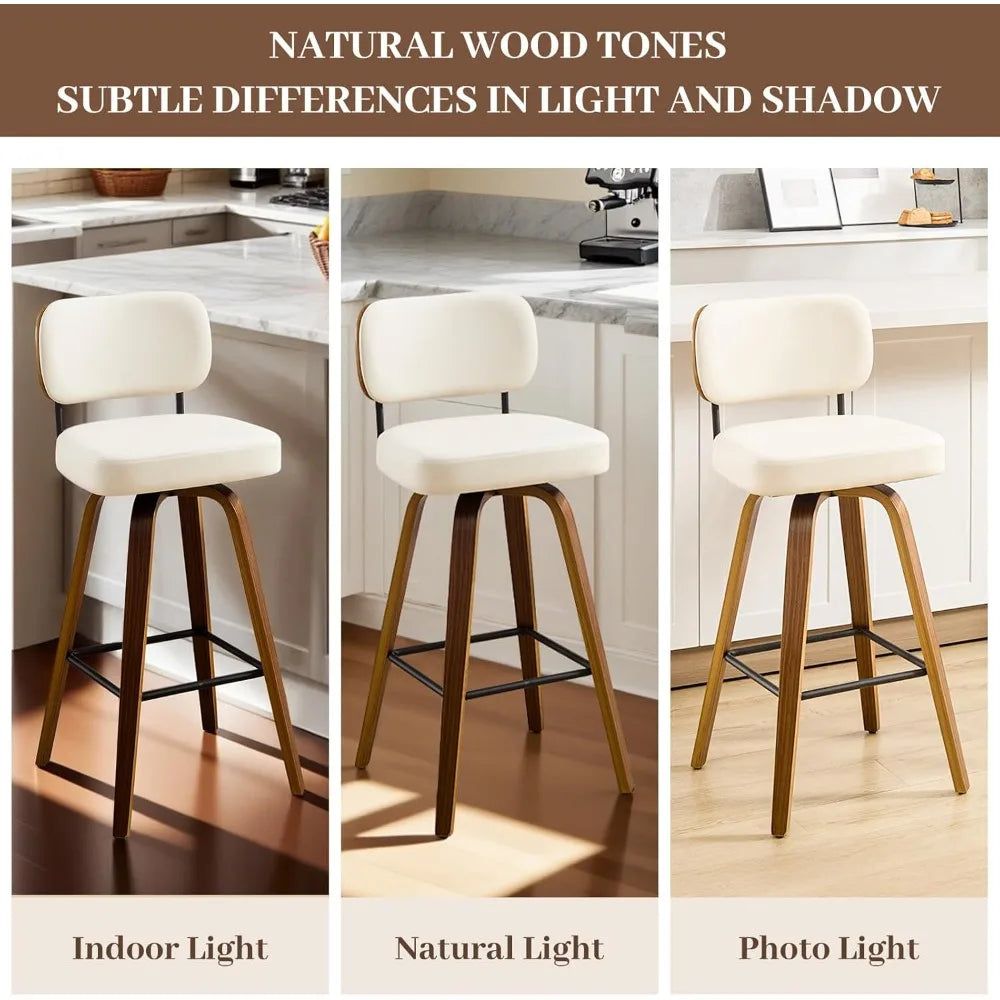 Meet the Counter Height Bar Stools Set of 2: all the style and durability you want, at a price that makes sense. These 26-inch upholstered faux leather barstools combine mid-century design with practical features, making them a smart choice for anyone looking to furnish their kitchen or bar area with pieces that are both attractive and built to last. Crafted with care, each stool features a natural walnut bentwood frame that not only highlights a beautiful wood grain pattern but also offers the strength and resilience needed for everyday use. The legs are made from FSC-certified wood, ensuring responsible sourcing and environmental mindfulness. This sturdy frame supports up to 300 pounds, giving you confidence in their durability. The seat is upholstered in cream white PU leather, a smooth and easy-to-clean material that balances comfort with practicality. Inside, a high-density sponge cushion provides a supportive yet gentle seat that maintains its shape over time. Whether you’re enjoying a quick breakfast or catching up with friends, these stools offer a cozy spot to sit. Designed for convenience, these stools swivel a full 360 degrees, allowing you to move effortlessly without having to get up. The rectangular metal footrest adds extra comfort and support for your feet, while four adjustable feet help stabilize the stool on various floor surfaces, so you won’t have to worry about wobbling or unevenness. The bar stools come with two ergonomic backrest options. You can choose the braided PE rattan backrest, crafted from premium plastic material that mimics real rattan with a smooth texture, or the upholstered backrest featuring a wooden board with PU leather upholstery accented by a unique wood grain finish. Both options blend mid-century style with functional comfort, enhancing any space from kitchen islands to home bars. Why You'll Love It: