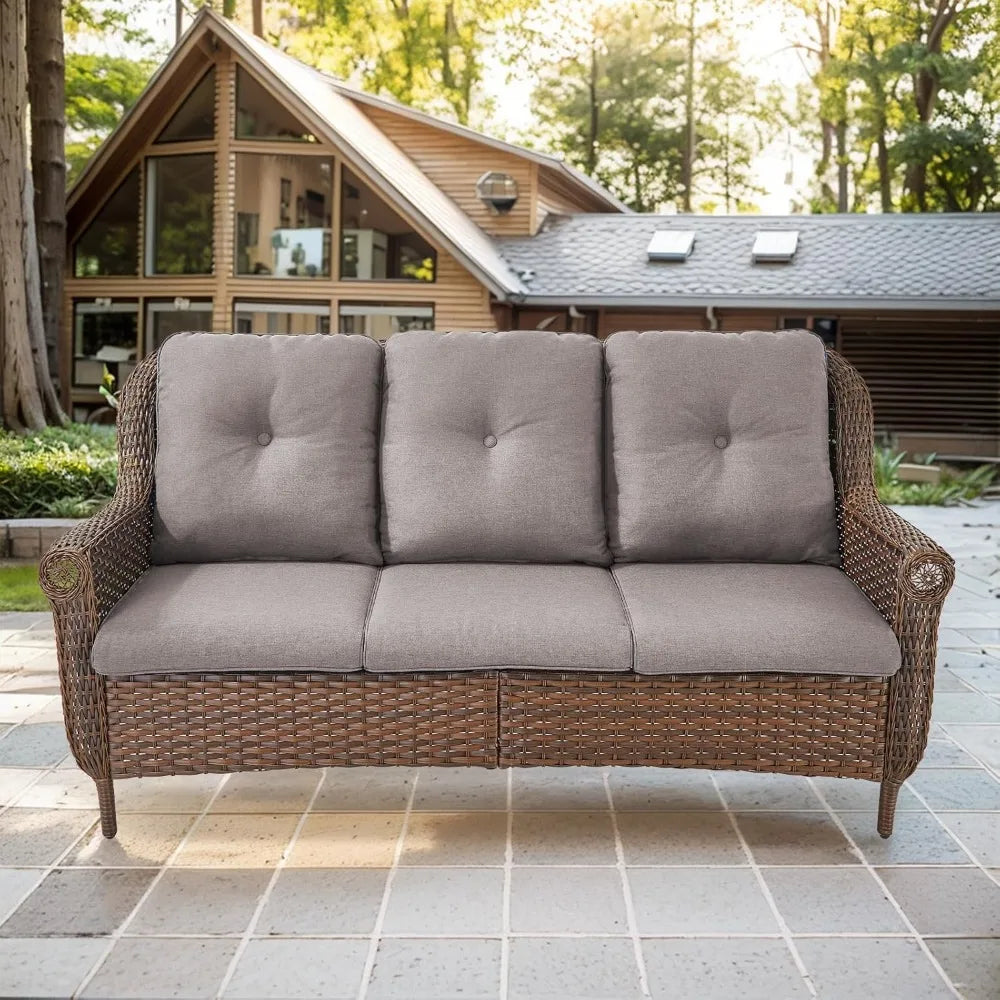 Meet the Brown 3-Seat Wicker Rattan Sofa with Chrysanthemum Armrests and Water-Resistant Cushions from FurnitureZ: all the style and durability you want for your outdoor space, at a price that’s smart and affordable. Designed to bring comfort, charm, and practicality to patios, decks, or gardens, this sofa is a thoughtful choice for anyone who values quality without overpaying.