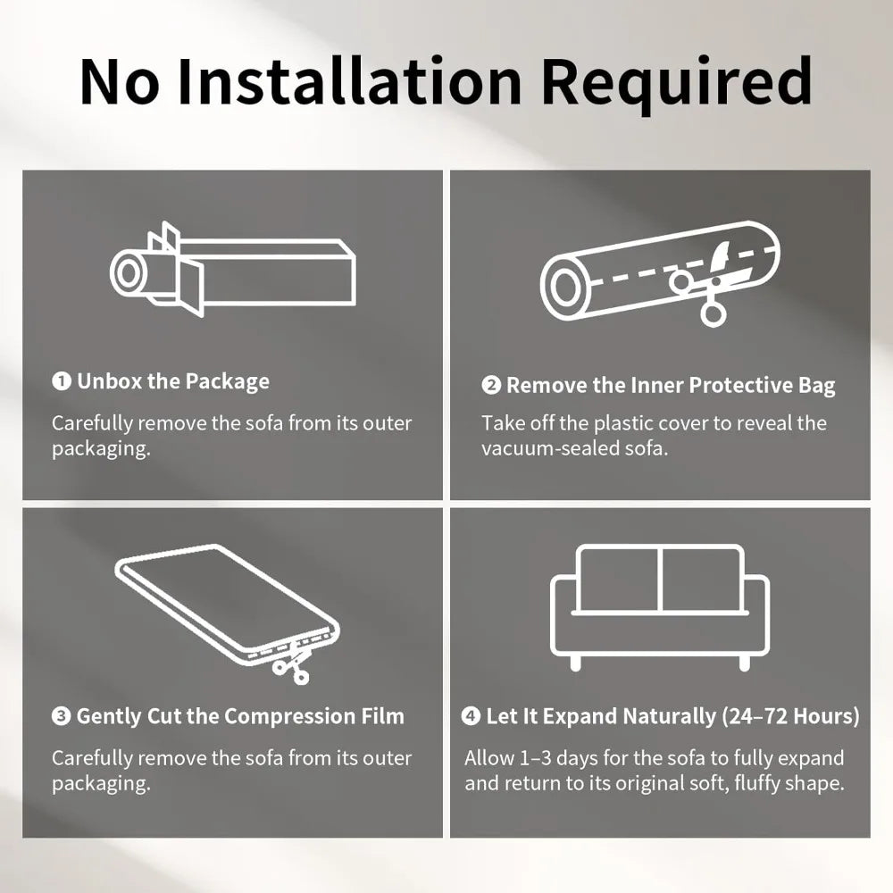 Assembly is straightforward—no extra tools or complicated instructions needed. The sofa arrives compressed and vacuum-sealed, which not only cuts down on shipping costs and environmental impact but also makes delivery more convenient. Once you unpack it, simply allow the foam to fully expand, and your sofa is ready to use without any hassle.