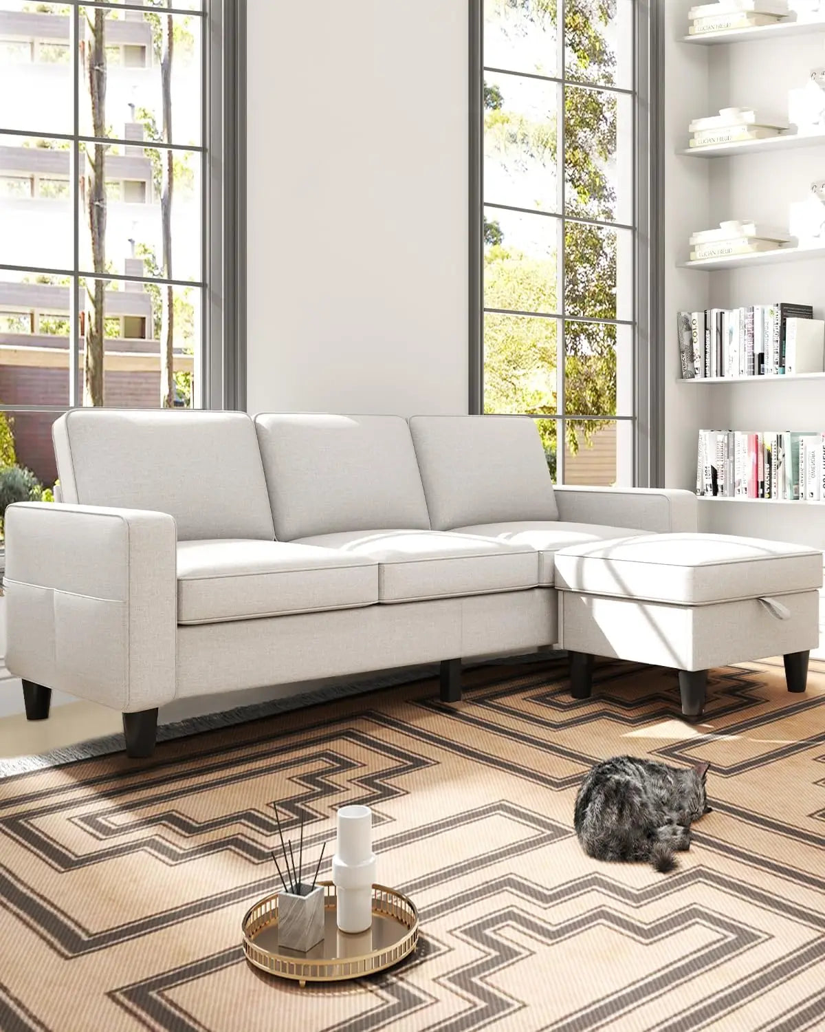 Designed with versatility in mind, the sectional’s reversible ottoman can be moved and arranged to fit your space and needs. This flexibility lets you create a multifunctional seating area, perfect for lounging or entertaining. Plus, both the sofa and ottoman include built-in storage compartments—ideal for stashing blankets, magazines, or other essentials—helping you keep your room tidy and organized without sacrificing style.