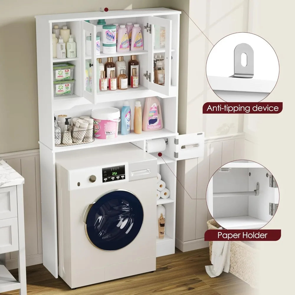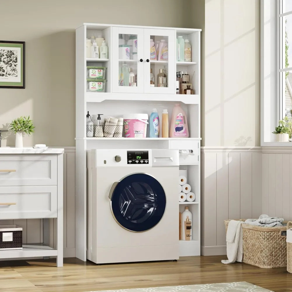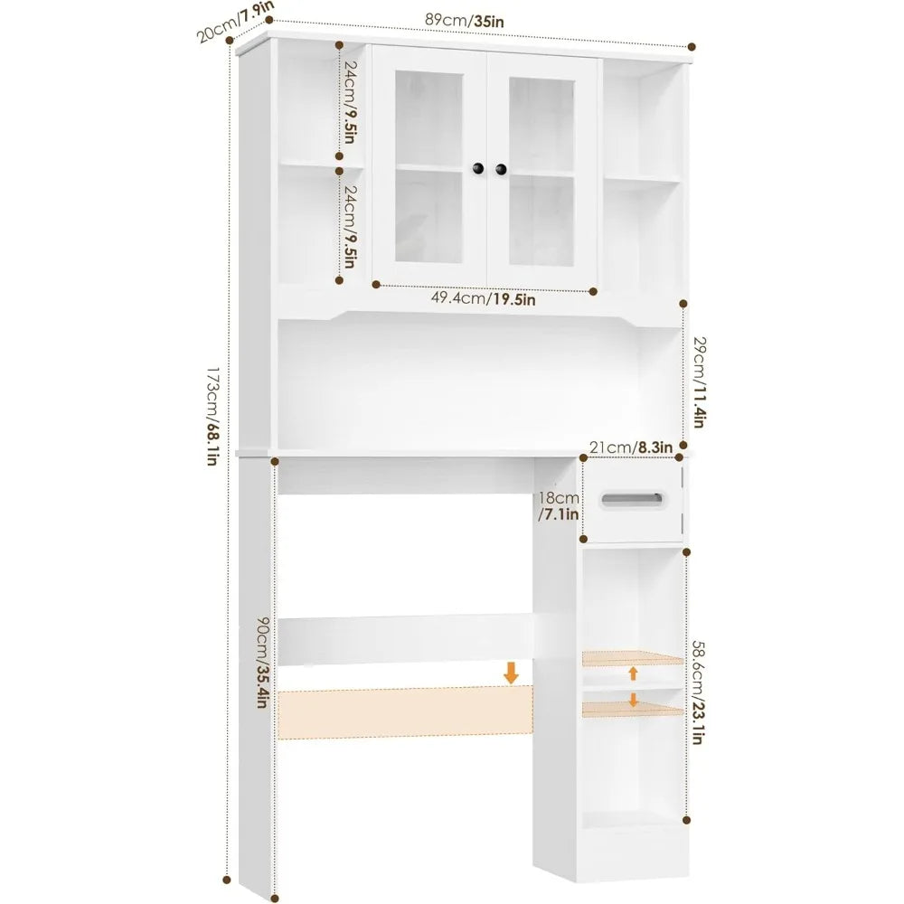 Crafted from sturdy PBGlass material, the cabinet stands on a solid freestanding frame that promises durability and stability. Its modern white finish fits seamlessly into a variety of bathroom decors, bringing a clean, fresh look to your space without overwhelming it. The compact dimensions of 7.9"D x 35"W x 68.1"H are specifically chosen to fit most standard toilets and even some compact washing machines, making it a versatile choice for small bathrooms, laundry rooms, or any tight space where storage is at a premium.