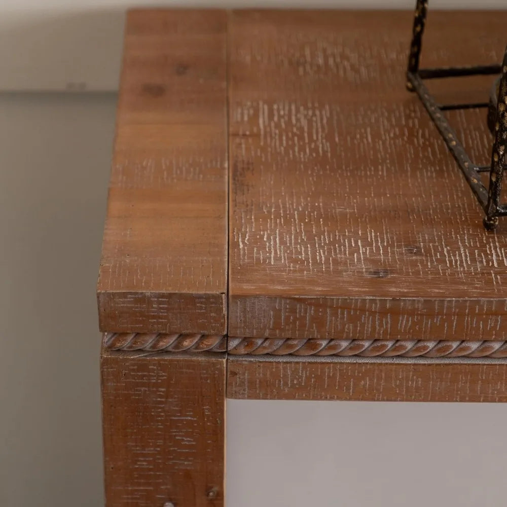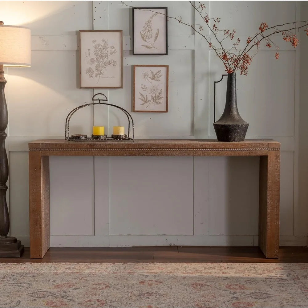 The design centers on clean, minimalist lines with a rustic farmhouse twist. Its rectangular shape and curved waterfall-style edges are enhanced by a decorative beaded trim, giving the table a unique, elegant look without overwhelming your space. Measuring 59"D x 15.31"W x 31.8"H, it offers ample surface area to display lamps, vases, picture frames, or other decorative items that welcome guests and personalize your home.