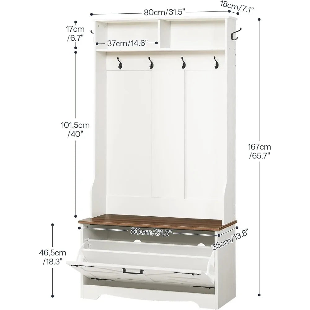 - Multi-Functional Design: Includes two top open compartments for displaying decorative items or everyday essentials, six sturdy hooks for coats, hats, and bags, plus a bottom shoe cabinet that can hold about 8 pairs of shoes.