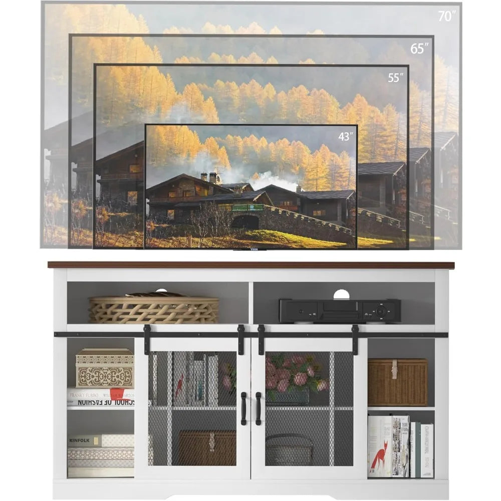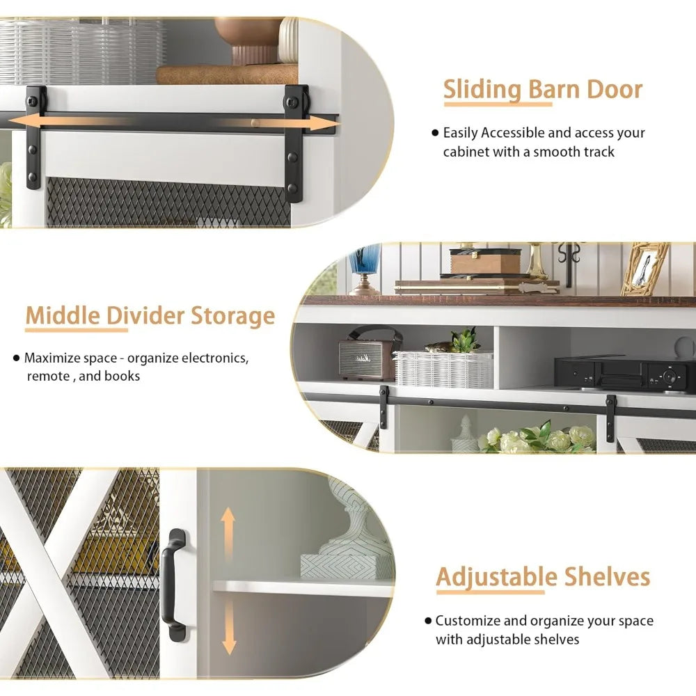 The farmhouse style is evident in the two sliding mesh barn doors, which not only add a warm, rustic touch to your space but also offer flexible access to your media storage. Whether you prefer the doors open or closed, they move smoothly and help keep your electronics organized and dust-free. Behind the doors and in the open shelves, you’ll find ample storage space: eight compartments in total, including a 5.7-inch high shelf perfect for a soundbar, gaming consoles, DVDs, or CDs. This setup keeps your media gear neatly arranged and easy to reach.