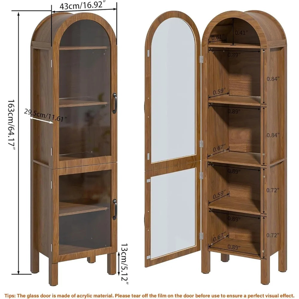 Meet the Tall Arched Display Cabinet with Acrylic Glass Doors from FurnitureZ: a smart, stylish storage solution designed to bring both elegance and function to your modern kitchen or living space. This cabinet offers real quality at a price that makes sense, proving you don’t have to overspend to enjoy durable, attractive furniture. Crafted with a combination of sturdy MDF and clear acrylic glass doors, this cabinet is built to last while keeping your cherished items safe and visible. The MDF frame provides reliable strength and stability, ensuring the cabinet stands firm through everyday use. Meanwhile, the acrylic glass doors are unbreakable and easy to maintain, giving you a crystal-clear view of everything inside without the worry of fragile glass damage. Plus, a magnetic closure keeps the doors securely shut, protecting your valuables and helping maintain a neat appearance. With dimensions of 11.61 inches deep, 16.92 inches wide, and an impressive 64.17 inches tall, this cabinet offers ample storage across its five shelves. Each shelf can hold between 20 to 30 pounds, making it ideal for displaying a wide range of items—from books, wine bottles, and artwork to collectibles, antiques, and decorative pieces. Its tall, narrow design fits comfortably in smaller spaces, making it a practical choice for apartments, kitchens, dining rooms, or even playrooms. The arched top adds a touch of graceful charm, blending seamlessly with modern or classic decor styles. Its walnut finish brings warmth and richness to your room, enhancing your home’s ambiance while keeping your space organized. Adjustable feet allow you to level the cabinet on uneven floors, ensuring stability and protecting your flooring. Why You’ll Love It: