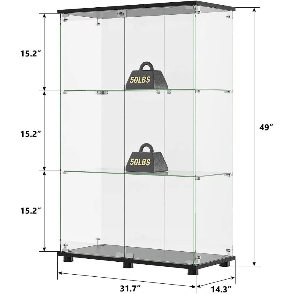 The cabinet measures 49.49 inches high, 31.77 inches long, and 14.37 inches wide, with interior shelf dimensions designed to accommodate a variety of objects: 15 inches in height, 16.7 inches in length, and 14.4 inches in width. The two lockable glass doors protect your valuables from dust while adding a refined touch to your living room, bedroom, office, or collection space.