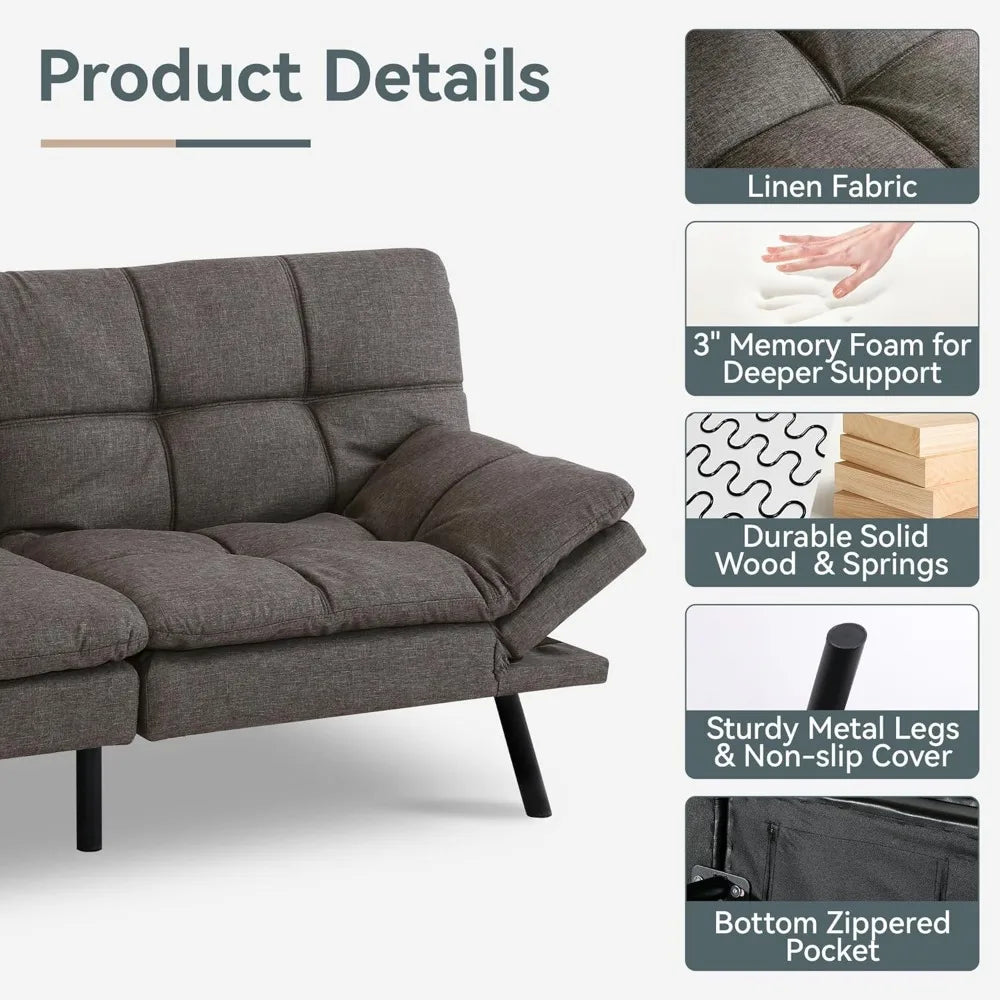 The quality extends beyond the frame and mechanism. Upholstered in breathable grey linen, this sofa bed combines a sleek, modern look with practicality. Linen’s natural texture adds warmth and character to your room while remaining durable and easy on the skin. Inside, a 3-inch layer of CertiPUR-US certified memory foam cushions your body, providing supportive comfort that relieves pressure points and promotes restful relaxation, no matter the season.