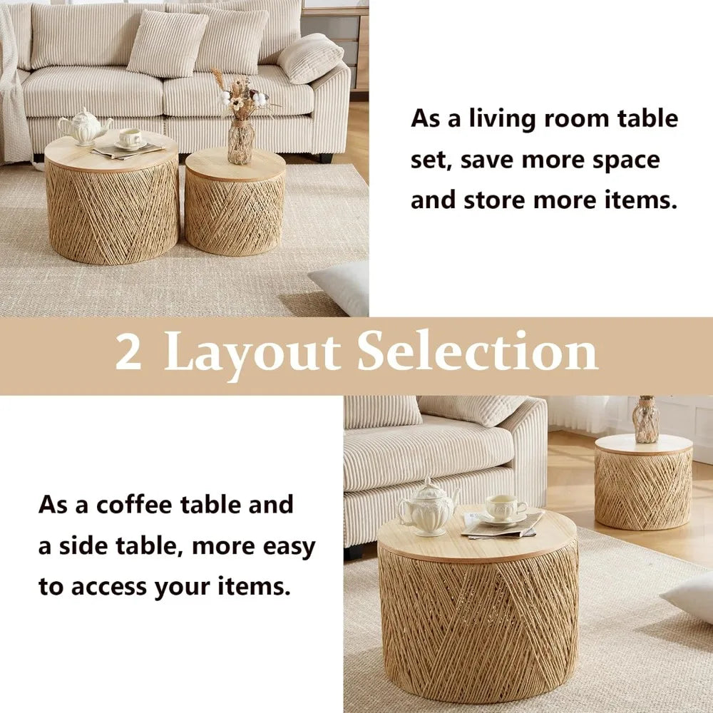 Beyond looks, these tables solve common living room challenges: the larger coffee table includes a built-in storage drum with a lid, perfect for keeping magazines, remotes, snacks, or other small items tucked away but within easy reach. Whether you need a compact coffee table for a cozy apartment, a side table for your sofa, or even a sturdy stool for kids, this set offers a flexible, practical solution that fits seamlessly into everyday life.