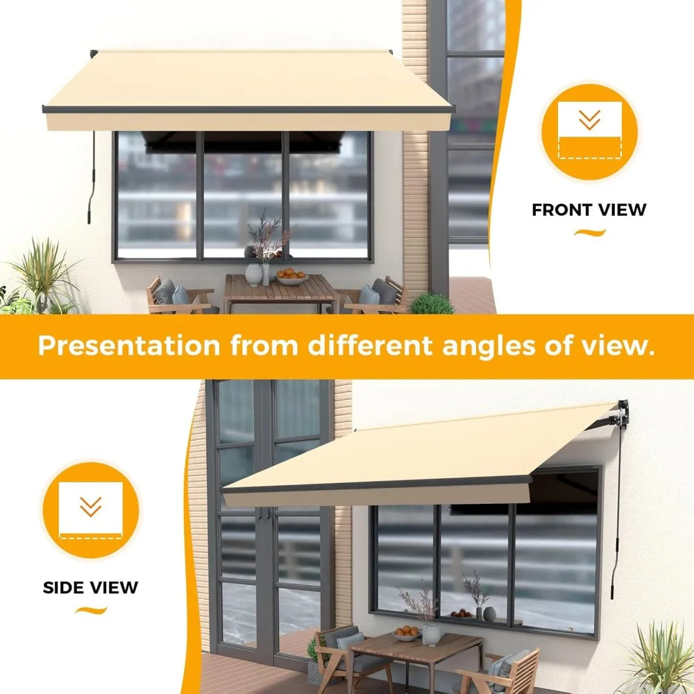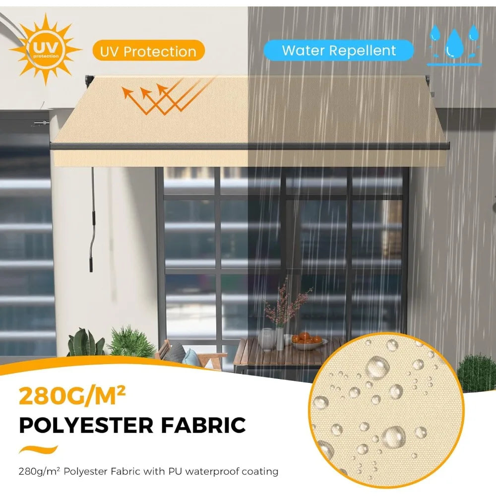 Meet the 10' x 8' Retractable Awning for Patio: all the style and durability you want, at a price you'll love. This smart addition to your outdoor space offers reliable sun protection and weather resistance, providing real value without compromising on quality or design. Crafted from 280g/m² high-density polyester fabric with a premium PU coating, the awning is designed to withstand the elements. Its water-resistant surface helps keep you dry during light rain, while the UV and sun-fading resistant finish offers 50UV+ solar protection, making it a practical shield against harsh sunlight. This means you can enjoy your patio comfortably on sunny days while protecting your furniture and skin from UV damage. Keep in mind, this awning is primarily intended for sun and light rain protection rather than heavy storms. Operating the awning is straightforward and smooth, thanks to the manual crank handle. You can easily extend or retract the awning by rotating the crank clockwise or anticlockwise, allowing quiet and controlled adjustment. The flexible design lets you customize the height of the shaded area to suit your needs. Whether you're sipping afternoon tea, hosting a gathering, or simply relaxing outside, the adjustable extension arm and awning end heights give you precise control over the amount of shade you want. This retractable awning is versatile enough for a variety of outdoor settings. It fits perfectly on backyard decks, garden patios, front porches, and balconies in residential homes. It also suits commercial spaces like restaurants, shops, and cafes, adding both function and subtle style. Its clean, simple beige color and design blend seamlessly with many outdoor decors, enhancing your space without overwhelming it. Installation is made easier with a comprehensive kit that includes everything you need: the awning, crank handle, brackets, two retractable mounting brackets, a clear instruction manual, an installation video, and all necessary hardware. While operating the awning with the hand crank is simple, we recommend having two people for installation to ensure safety and accuracy. Before starting, make sure you have a power drill with bits, tape, and a wrench handy to complete the setup efficiently. For optimal performance, the awning should be installed at a height between 8' and 12'. The mounting bracket’s tilt can be adjusted between 5 and 60 degrees, allowing you to tailor the angle of the shade to your specific environment. It's best suited for installation on sturdy surfaces like concrete walls, hard wooden walls, or solid brickwork. If your wall type varies—such as insulation panels, double brick, vinyl siding, or wood—it’s wise to consult a professional to ensure a secure mount. Why You'll Love It: