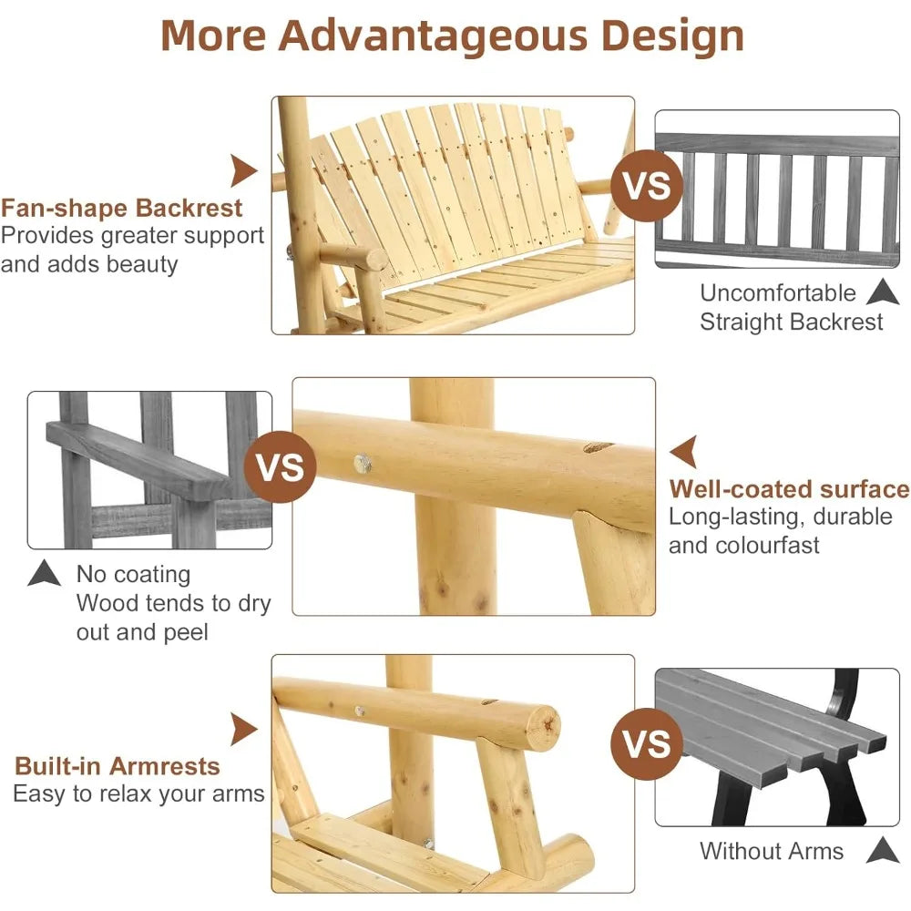 Meet the Wooden 2-Seat Porch Swing with A-Frame Stand: all the style and durability you want, at a price you'll appreciate. This outdoor patio swing bench combines smart design with quality materials, making it the ideal choice for anyone seeking a comfortable, lasting addition to their outdoor space without overspending. Crafted from solid fir and pine wood, known for their natural strength and eco-friendly qualities, this porch swing is built to withstand the elements. The wood is treated with a waterproof and corrosion-resistant finish, ensuring long-lasting beauty and performance. You won’t have to worry about rust either—the high-quality metal accessories come with an anti-rust coating, so your swing stays sturdy and attractive through all seasons. Plus, the smooth surface means no itchy sawdust, just a comfortable place to relax. Designed with practicality in mind, the swing’s 52-inch-wide seat easily accommodates two people, making it perfect for sharing a quiet moment or catching up with a friend. The slatted back and seat promote airflow, keeping you cool on warm days by effectively dissipating heat. This thoughtful design means you can enjoy hours outdoors without feeling uncomfortable or overheated. The freestanding A-shaped metal and wood frame allows you to place the swing wherever it suits you best—whether on a porch, patio, garden, or backyard lawn. This frame is engineered for stability and strength, connecting securely to the swing seat with heavy-duty metal hooks. Thanks to reinforced screw connections, the entire structure supports up to 550 pounds without wobbling, giving you peace of mind as you relax. Comfort meets safety with an ergonomic design tailored to support your body. The wide seat, high fan-shaped backrest, and cylindrical armrests help relieve pressure on your neck and shoulders. Additional support rails and a stable swing stand keep your balance steady, whether you’re enjoying a cup of coffee or diving into a good book. The seat height is carefully set to reduce knee strain, and adjustable S-hooks let you customize the swing height to your liking. This versatile swing isn’t just for outdoor use. Its delicate wood grain and natural finish blend seamlessly with many decor styles, adding a charming rustic touch to your living room or balcony. Whether you want a peaceful spot to meditate, take a nap, or read, this swing offers a cozy retreat. And thanks to its durable varnish coating, it’s ready for use in any setting—from the garden to the porch, or even the backyard. Assembly is straightforward and all-inclusive. The package contains the solid wood log A-frame, the loveseat bench, metal hooks for hanging, and all necessary hardware. Detailed instructions guide you through the process, which shouldn’t take long even if it’s your first time assembling outdoor furniture. With dimensions of 93” x 55” x 66” (L x W x H) and a weight capacity of 550 lbs, this swing delivers smart value without sacrificing quality or convenience.