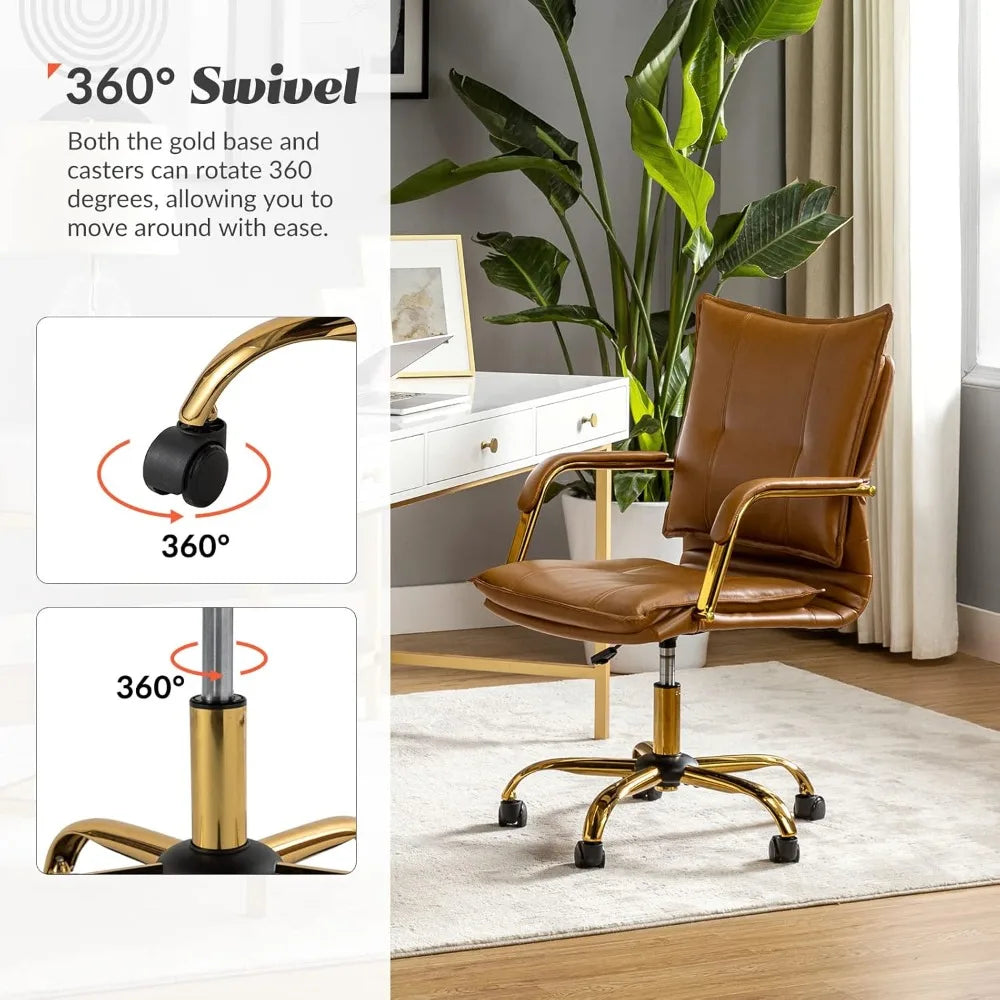 Meet the Faux Leather Home Office Desk Chair: a smart choice for anyone looking to blend style, comfort, and durability without stretching the budget. This chair offers a modern upgrade to your workspace with thoughtful design and quality materials that make it a reliable companion for daily use. Crafted with a solid engineered wood frame, this chair stands sturdy and steady, designed to support you through work, study, or gaming sessions. The seat and backrest feature soft foam cushioning wrapped in easy-to-clean faux leather. This combination provides a comfortable, supportive surface that holds its shape over time, making it an excellent choice for long hours at your desk. The fixed upright seating angle encourages good posture, supporting your back without the complexity of recline adjustments, ideal for focused tasks. The chair's golden metal legs and armrests add a touch of elegance with a durable powder-coated finish that resists scratches and wear. This thoughtful design detail means your chair keeps its refined look even with frequent use. The swivel base with five smooth-rolling casters allows easy movement around your workspace, enhancing your productivity by making it effortless to reach different areas without standing up. Designed to fit seamlessly into various indoor spaces, this chair suits your home office, study, living room, bedroom, or gaming setup. Its compact size—26 inches deep, 22.2 inches wide, and 40 inches high with adjustable seat height ranging from 36.3 to 40 inches—makes it a smart pick for smaller rooms or apartments where space is valuable. Why You'll Love It: