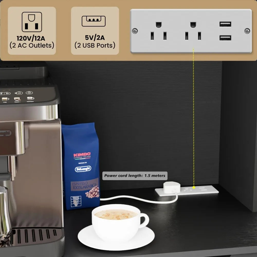 - A built-in power outlet station featuring 2 USB ports and 2 electrical outlets, so you can conveniently charge devices or plug in small kitchen appliances without extra cords cluttering your counters.