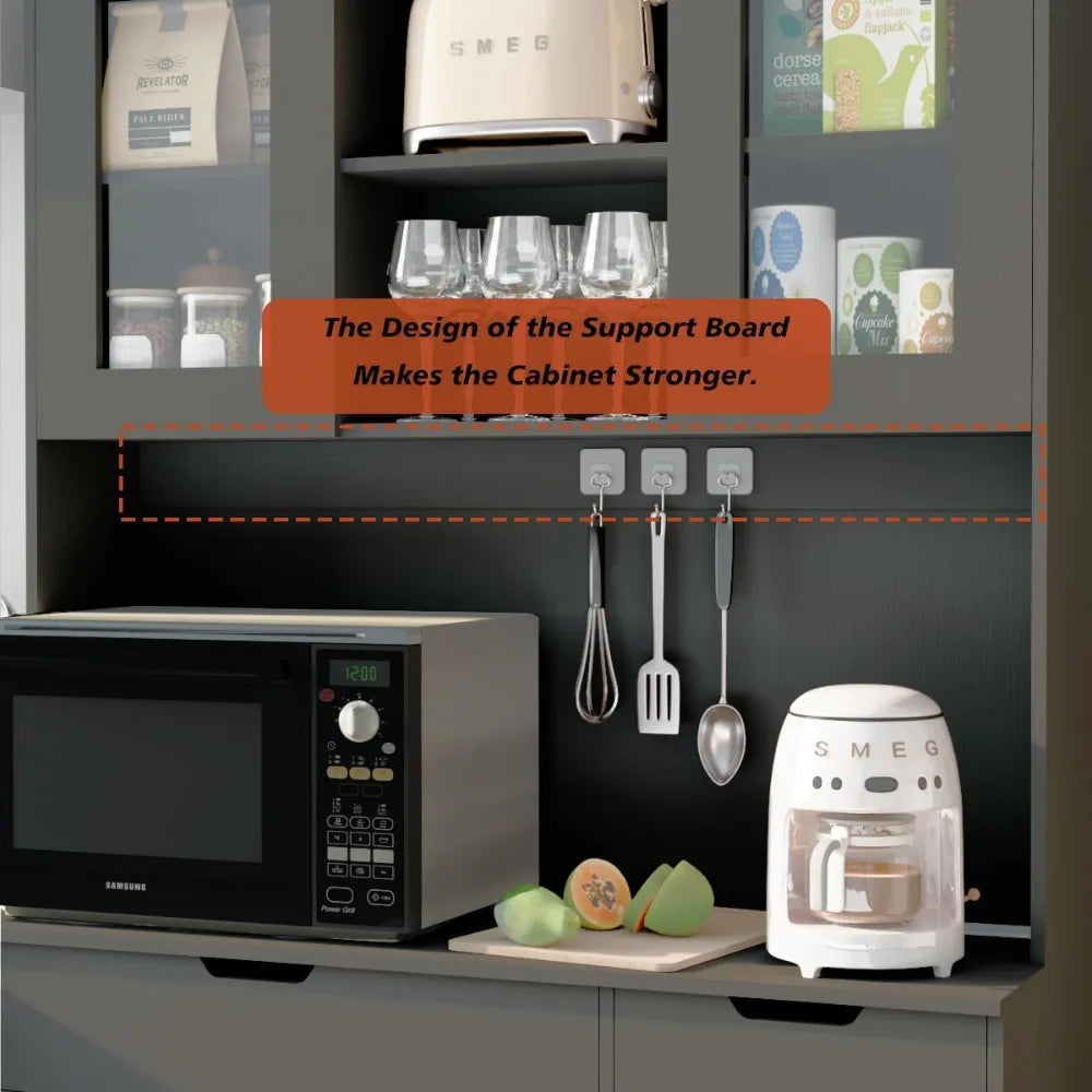 Meet the Large Farmhouse-Style Kitchen Pantry Cabinet with Microwave Stand, Charging Station, and Adjustable Shelves from FurnitureZ: all the style and versatility you want, at a price that fits your budget. This thoughtfully designed pantry cabinet is the smart way to add practical storage and a charming farmhouse look to your kitchen or dining area without overspending.