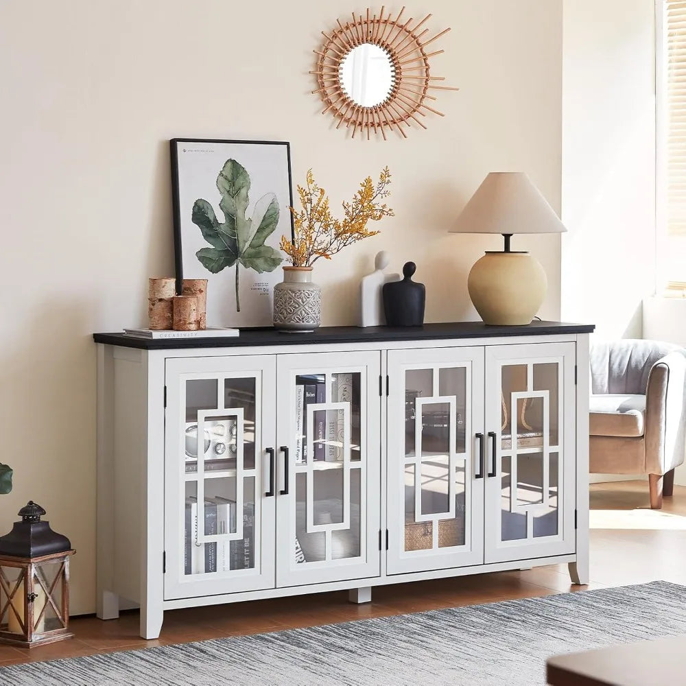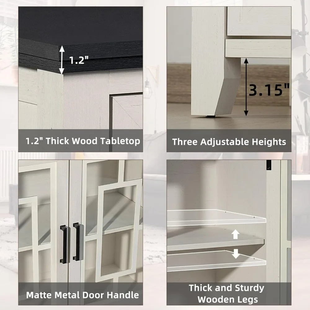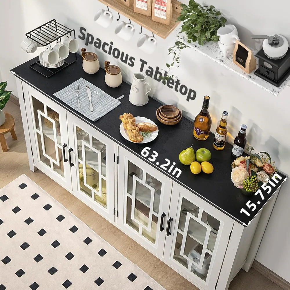 Crafted from solid wood and finished in a clean white tone, this cabinet showcases an authentic farmhouse aesthetic with natural wood textures that add warmth and character to any room. The 63.2" wide by 15.75" deep surface provides ample room to display your favorite appliances like coffee machines or decorative items, helping you keep counters clear and organized. Four HD glass doors not only enhance the cabinet’s visual appeal but also protect your stored items while making them easy to find at a glance.