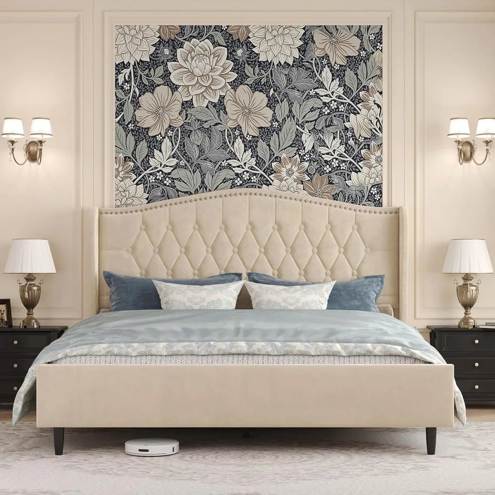 Meet the Luxury Velvet Wingback Platform Bed Frame with Button Tufting and Nailhead Trim — all the style and durability you want, at a price you'll appreciate. This queen-sized bed frame combines timeless elegance with practical design, making it a smart choice for anyone looking to elevate their bedroom with quality and comfort that lasts.