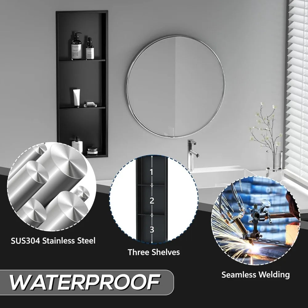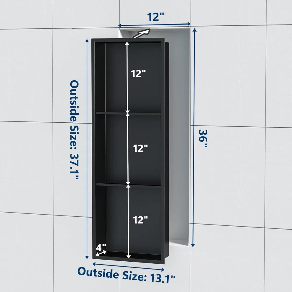 Measuring a generous 12 inches wide by 36 inches high and 4 inches deep, this triple-tier recessed shelf provides ample space to organize your shower essentials neatly. Whether you want to keep shampoo, conditioner, soap, or razors within easy reach, this niche helps keep your shower clutter-free and streamlined. Its recessed design means it fits flush with your wall, saving valuable space and creating a seamless bathroom look without protruding shelves.