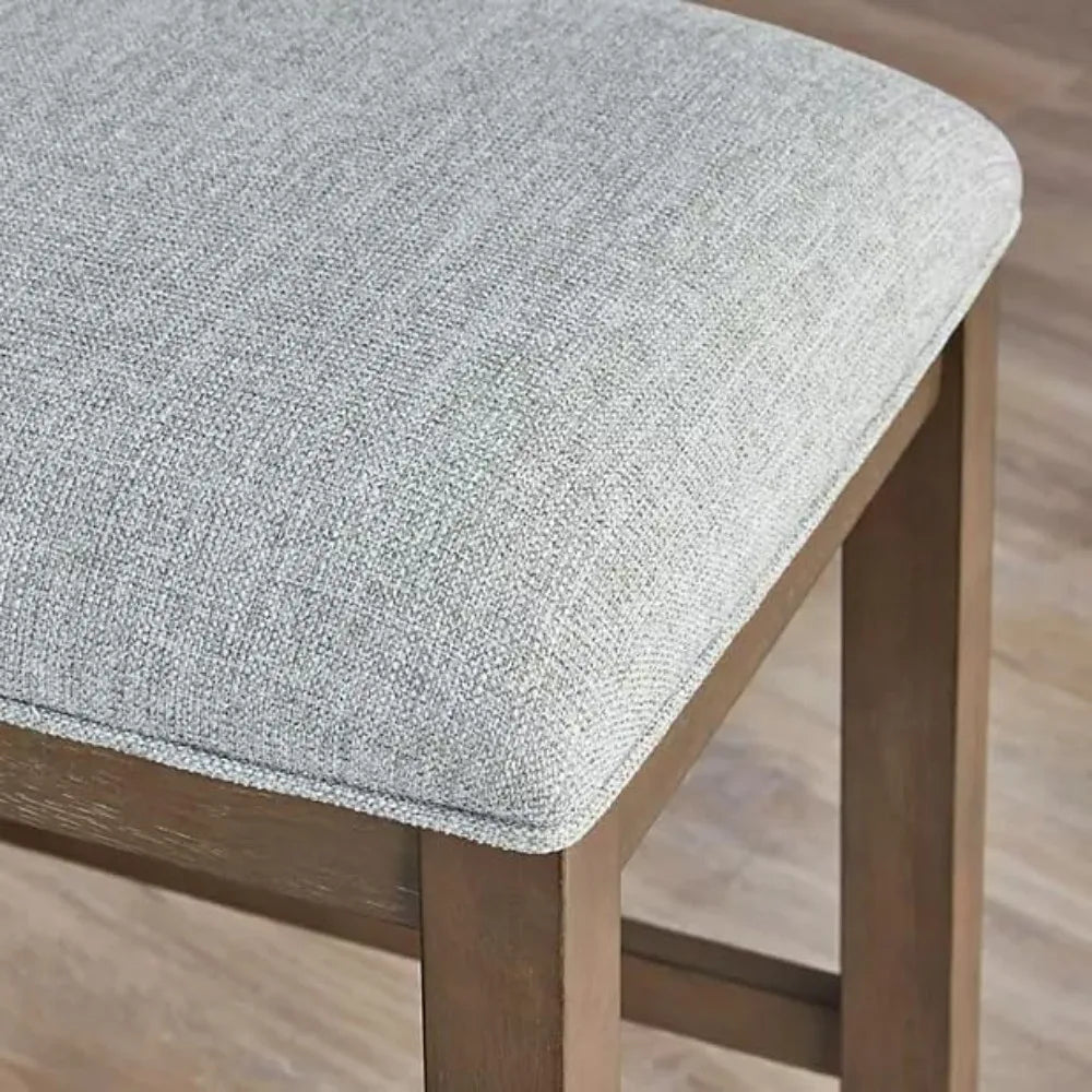 The stools feature upholstered cushioned seats in a light gray fabric, designed for comfort and practicality. Each stool includes sturdy footrests for added stability, supporting you comfortably whether you're sitting for a quick meal or settling in for a focused work session. When not in use, the stools nest neatly under the table, making this set a smart choice for smaller apartments, first homes, or rooms where space is at a premium.