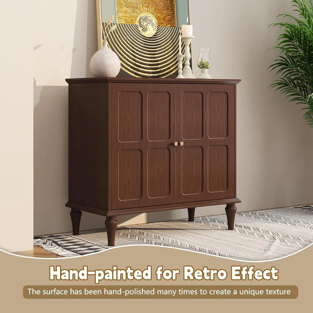 The cabinet doors have a unique mid-century vintage look, achieved through careful hand sanding that brings out a warm, textured finish. This attention to detail lends character and charm, making the buffet not just a storage solution but a design statement. You can also adjust the door height, depth, width, and panel gap by tweaking the door hinge screws, ensuring a perfect fit and smooth operation.