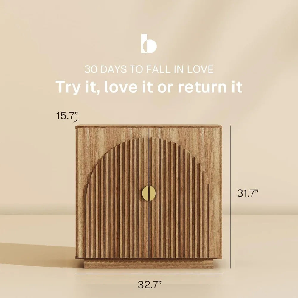 The standout design features include beautifully symmetrical arched door panels accented by flowing curves and hand-nailed decorative strips. These details add a sophisticated, mid-century modern flair without overwhelming your décor. Complementing this design are the golden semi-circular handles, which bring a subtle touch of luxury and make opening the doors effortless.