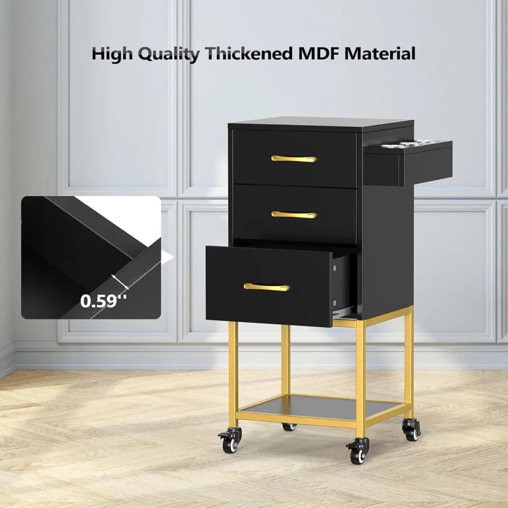 Built with environmentally friendly MDF board and a durable metal frame, the cart offers a reliable structure that stands up to daily use. The MDF board is 0.59 inches thick, ensuring strength without unnecessary weight, while the metal frame adds stability, so your tools and products stay safely in place. The sleek Black Gold finish gives it a professional look that complements a variety of salon décors, from barber shops to manicure studios.