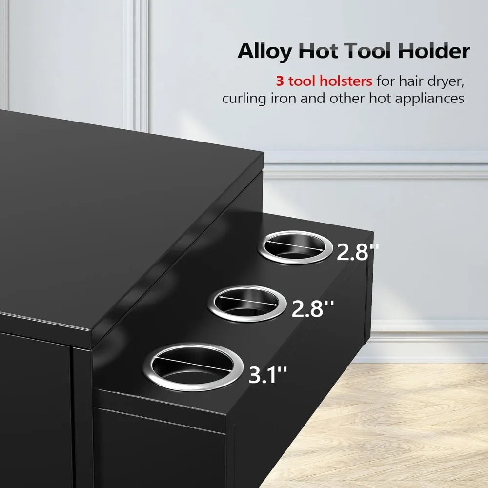 Storage is the heart of this design. The bottom compartment measures 9.8 inches high, providing ample space for larger items like shampoo bottles and beauty equipment. Above that, you'll find three spacious drawers ideal for organizing hair tools, brushes, and smaller essentials. Additionally, the cart features three heat-resistant racks on the side—perfect for holding hot styling tools such as dryers and straighteners, keeping them within easy reach but safely separated from other items.