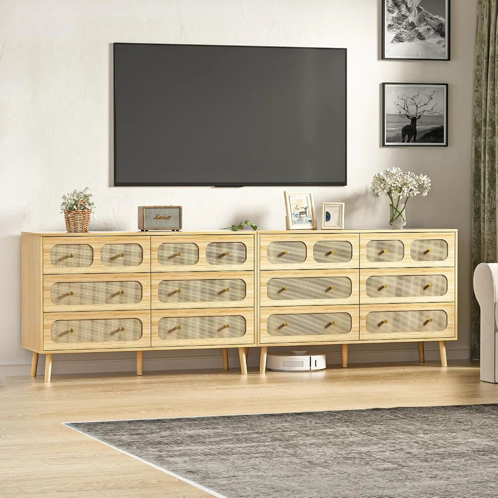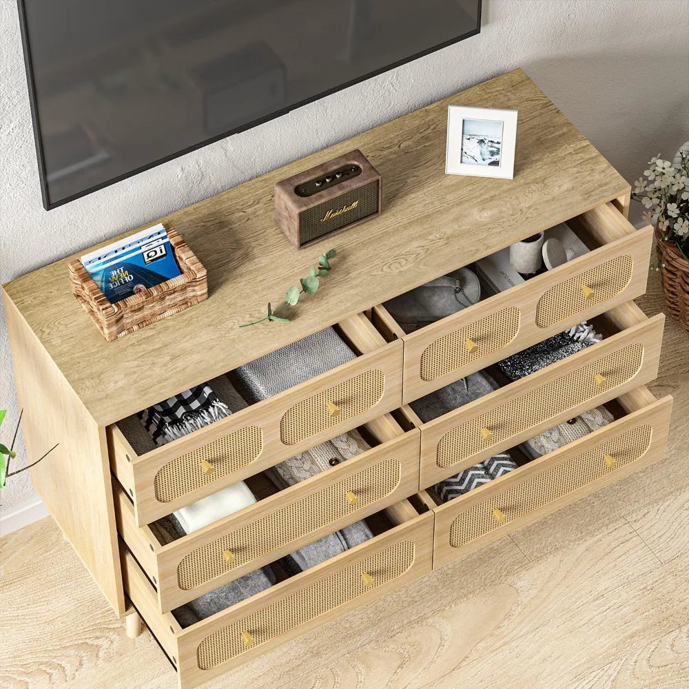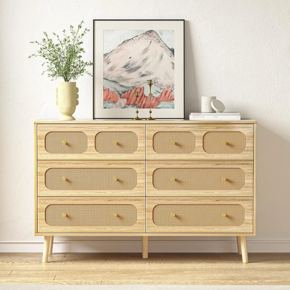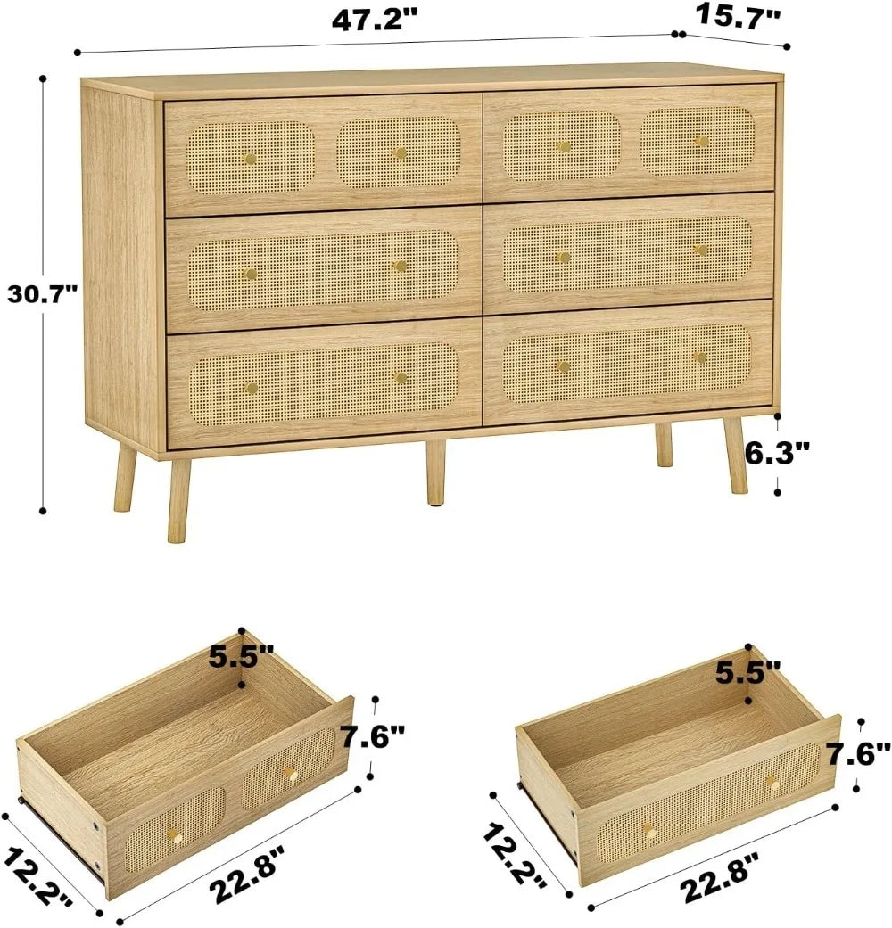 Crafted with attention to detail, this dresser features a solid wood board construction that ensures lasting strength and stability. The eco-friendly engineered wood used is both reliable and safe, helping you maintain a healthier home environment. Its woven rattan accents, slanted legs, and gold knobs add a touch of elegance, making it a standout piece that complements a variety of decor styles.