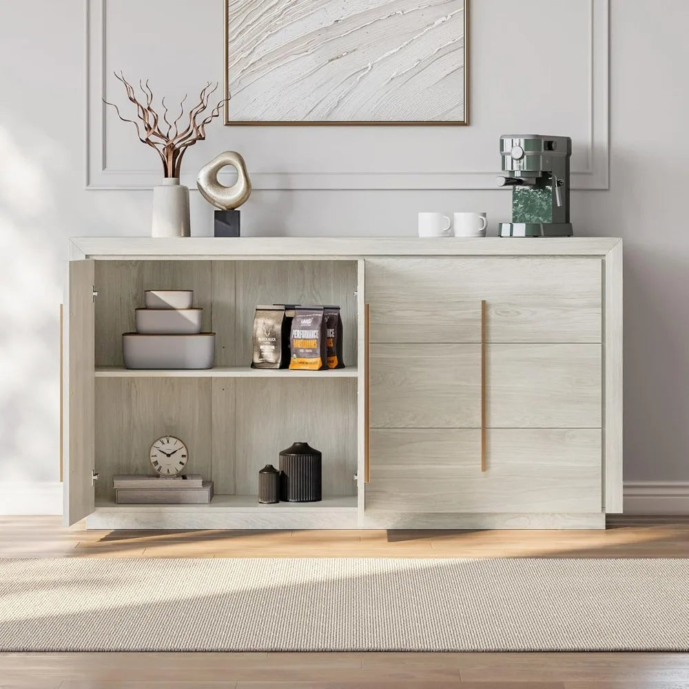Crafted from high-quality engineered wood, this sideboard is built to last while maintaining a sleek look. The sturdy construction ensures stability, and the materials have been chosen with care to avoid harsh chemicals, contributing to a healthier home environment. Its white sand finish offers a neutral yet sophisticated appearance that complements a wide range of décor styles.