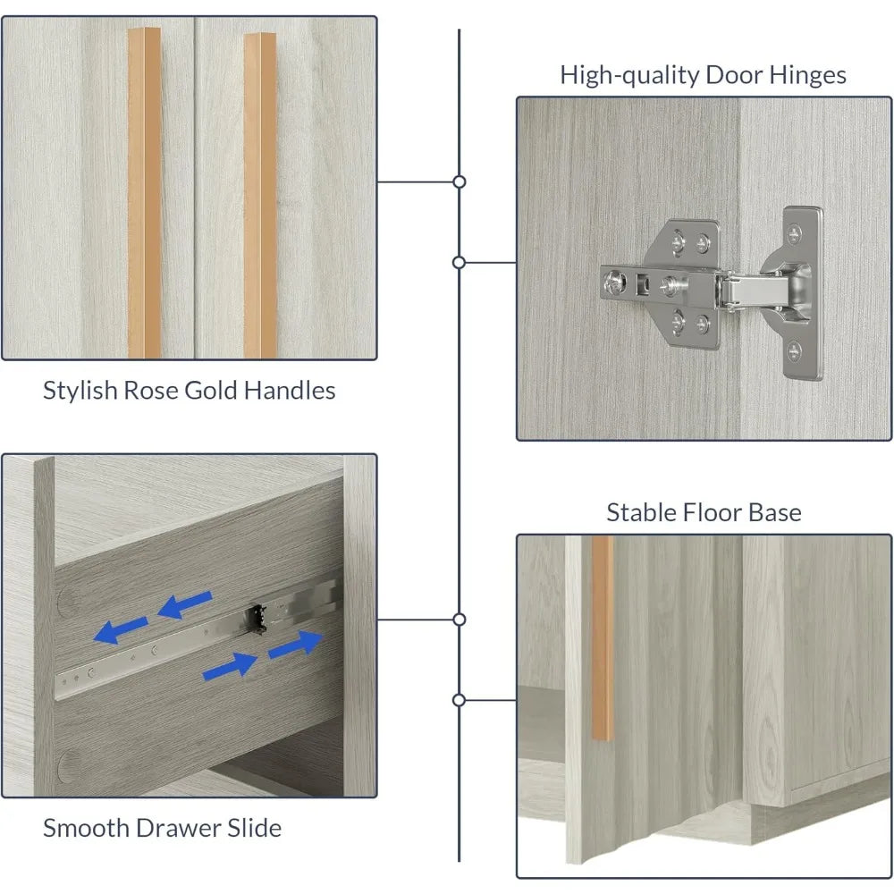 What sets this cabinet apart is its thoughtful design details. The doors feature a subtle fluted pattern that adds texture and visual interest without overwhelming the room. Rose gold metal handles bring a touch of refined style, balancing modern aesthetics with functionality. With two doors and three spacious drawers, plus adjustable shelves inside, you get flexible storage options designed to accommodate everything from dinnerware to decorative accents.