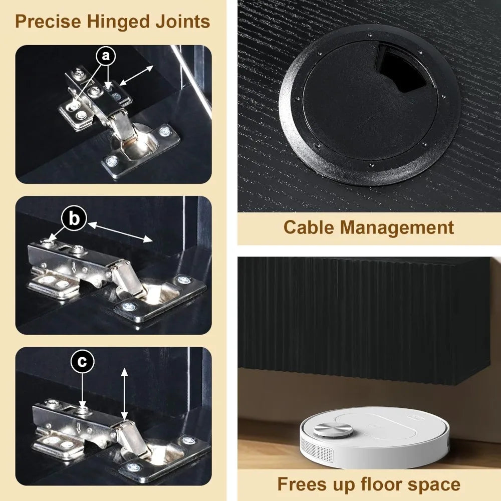 This TV stand is thoughtfully designed with three spacious compartments behind its doors, giving you ample storage for media devices, books, or decorative items. Keeping your space tidy is easier thanks to built-in cable management holes at the top and bottom, which help hide cords and cables for a clean, clutter-free appearance.