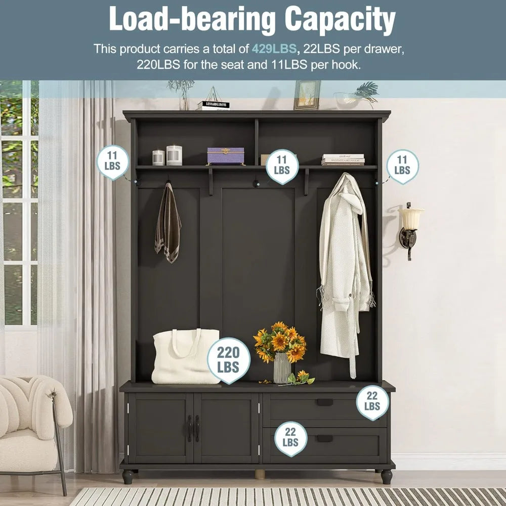 Crafted from engineered wood and metal, this hall tree is built for everyday use. The engineered wood provides a stable, durable structure that resists warping and wears well over time, ensuring you won’t need to replace it anytime soon. The sleek black finish adds a modern touch while blending effortlessly with various décor styles. The sturdy metal components, including smooth sliding rails and robust handles, enhance usability and reliability, so you can rely on this cabinet day after day.
